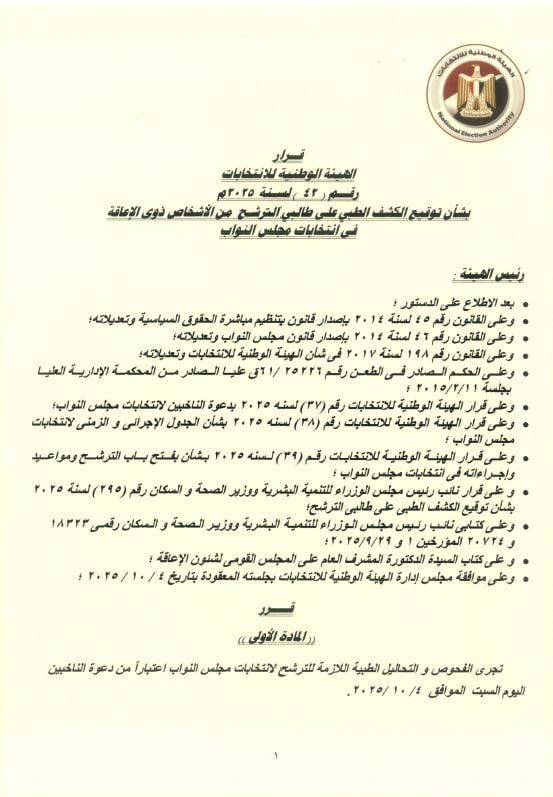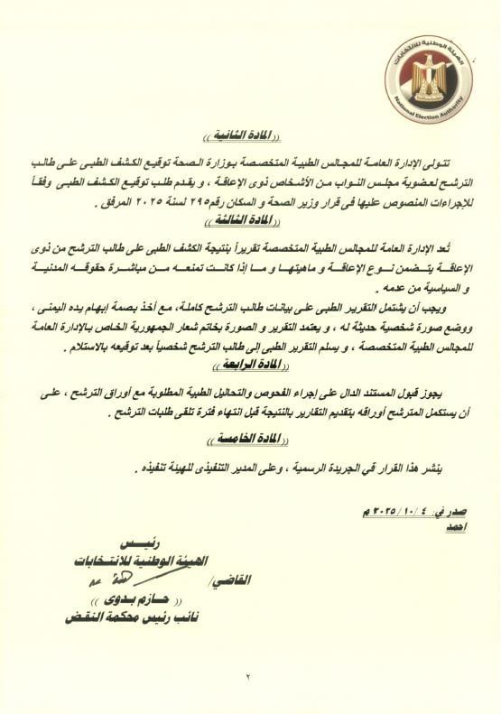 ونص القرار على أنه تجرى الفحوص والتحاليل الطبية اللازمة للترشح اعتبارًا من دعوة الناخبين اليوم السبت، وتتولي الإدارة العامة للمجالس الطبية المتخصصة بوزارة الصحة توقيع الكشف الطبي علي راغبي الترشح من الأشخاص ذوي الإعاقة في انتخابات مجلس النواب، ويقدم طالب توقيع الكشف وفقًا للإجراءات المنصوص عليها في قرار الصحة رقم 295 لسنة 2025، وجاء القرار كالتالي: