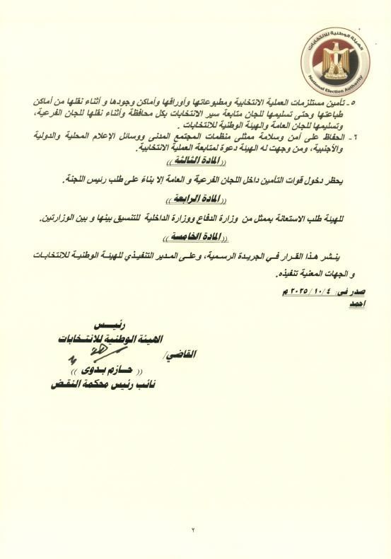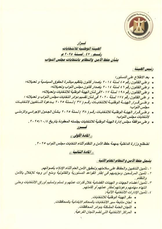 ونص القرار على أن تضطلع وزارة الداخلية بمهمة حفظ الأمن والنظام أثناء انتخابات مجلس النواب 2025.