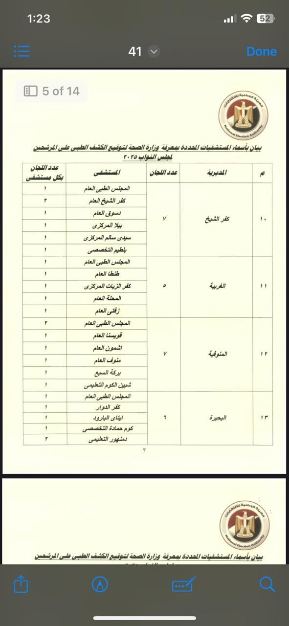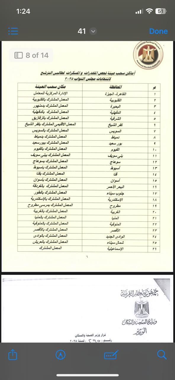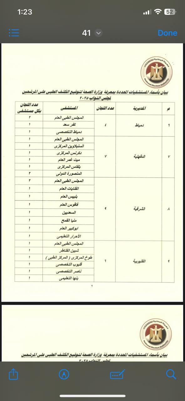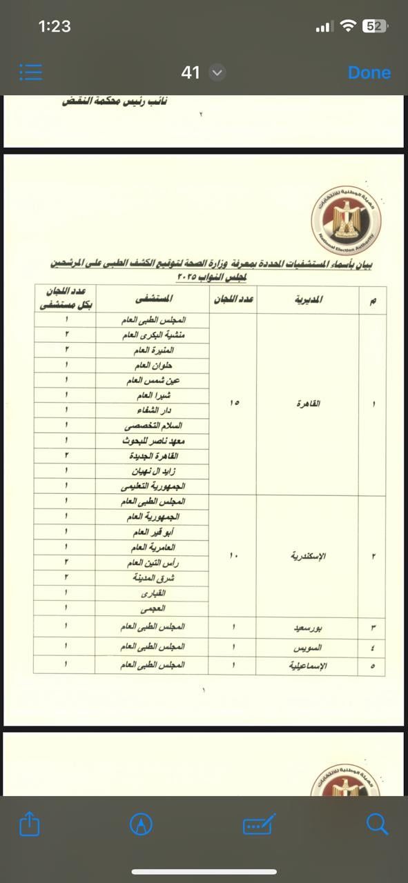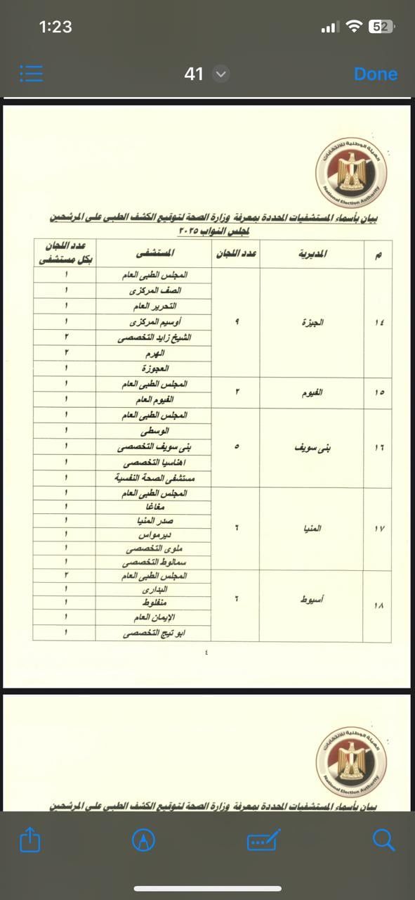 وأكدت الهيئة بالقرار رقم 41 لسنة 2025 علي طالب الترشح لمجلس النواب التقدم لتوقيع الكشف الطبي عليه وإجراء التحاليل اللازمة، وجاءت المستشفيات والمعامل كالتالي: