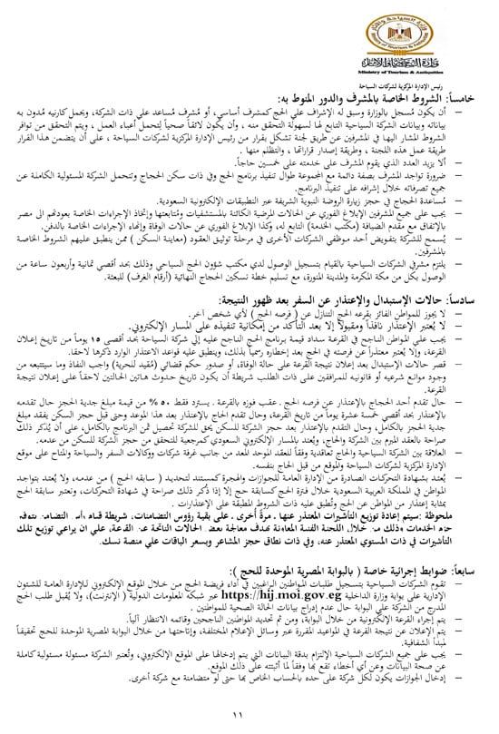وفوضت اللجنة العليا للحج والعمرة واللجنة الفنية المعاونة لها باستصدار أي ضوابط أو قرارات تنظيمية وفنيه ومن بينها تحديد مواصفات السكن وضوابط المشرفين وكذا إتخاذ اللازم لمواجهة ما قد يطرأ من مستجدات بدءًا من التحضيرات الخاصة ببدء الموسم وحتى نهايته وذلك درءًا لأية سلبيات قد تحدث أثناء العمل حفاظاً على الصحة العامة وحقوق ومصالح الحجاج وصون كرامتهم.