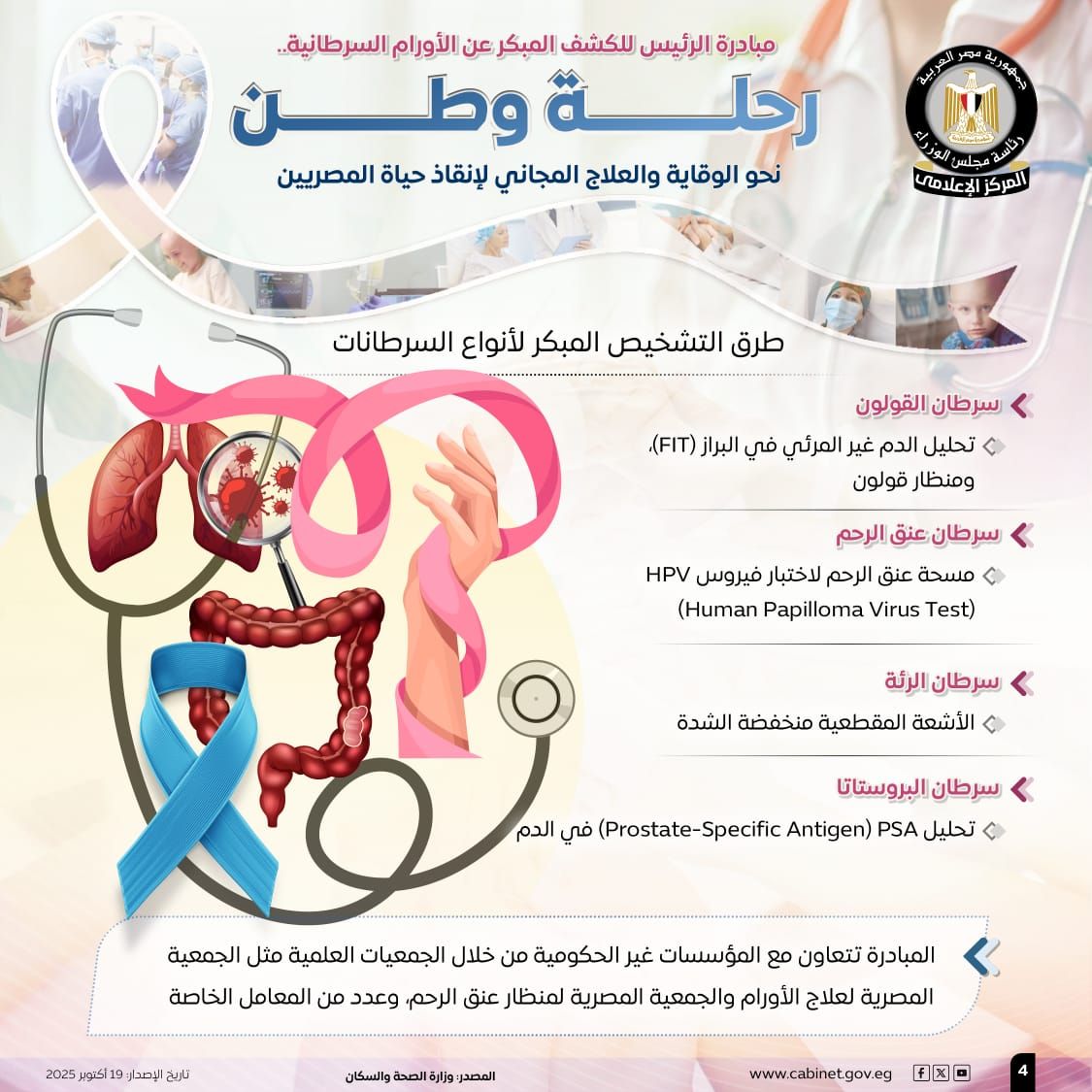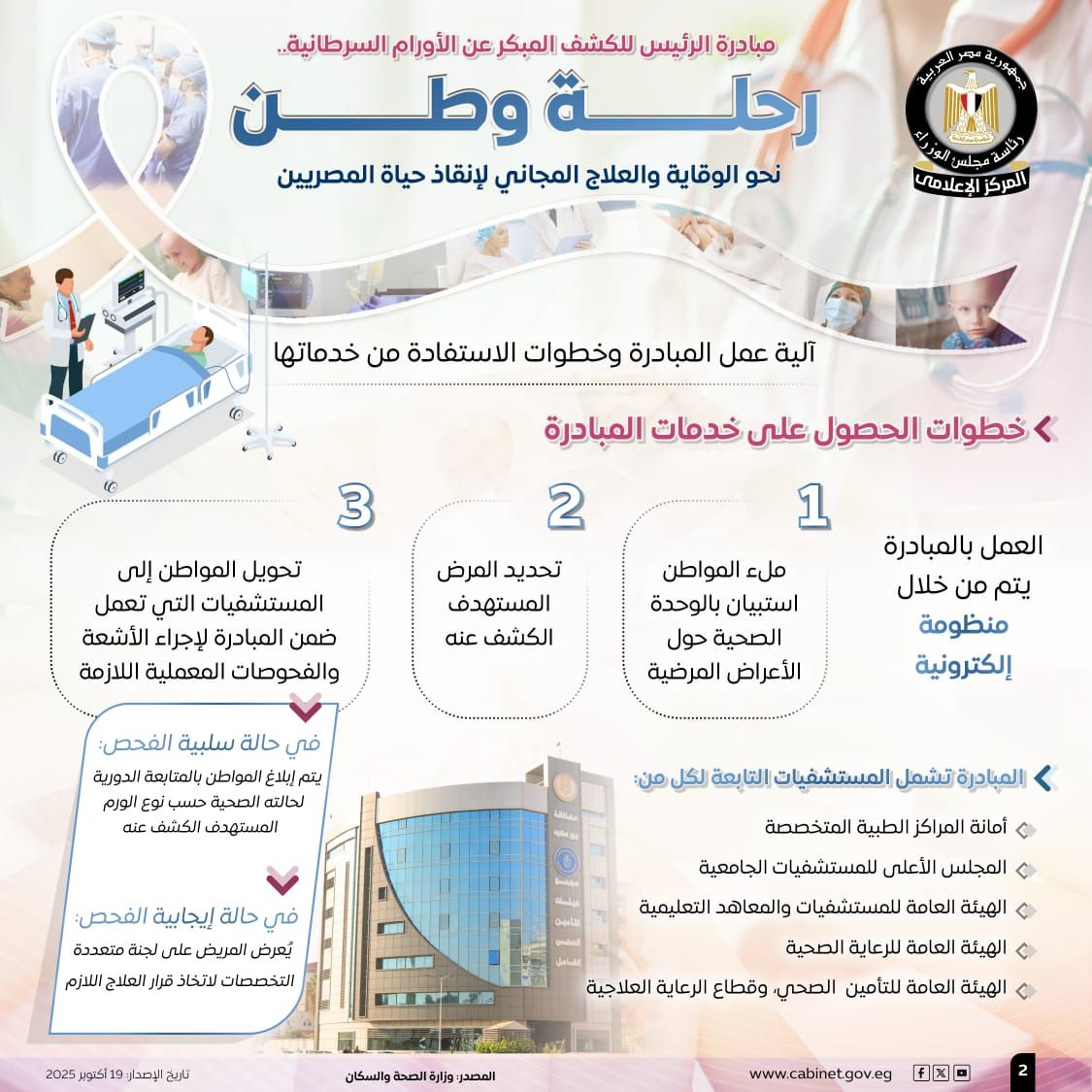 ويأتى ذلك في إطار حرص الدولة على بناء نظام صحي متكامل يضمن الارتقاء بصحة المواطنين، مع الاستمرار في تحقيق التغطية الصحية الشاملة وفقًا لأعلى المعايير العالمية، وتُعد المبادرة الرئاسية للكشف المبكر عن الأورام السرطانية إحدى الركائز الأساسية لهذه الجهود، إذ تعكس التزام الدولة بمواجهة الأمراض غير السارية، وفي مقدماتها الأورام السرطانية، عبر الاكتشاف المبكر وتقديم العلاج المجاني في المراحل الأولى، بما يسهم في رفع نسب الشفاء، وخفض معدلات الوفيات، وتعزيز الأمان الصحي للمواطنين.