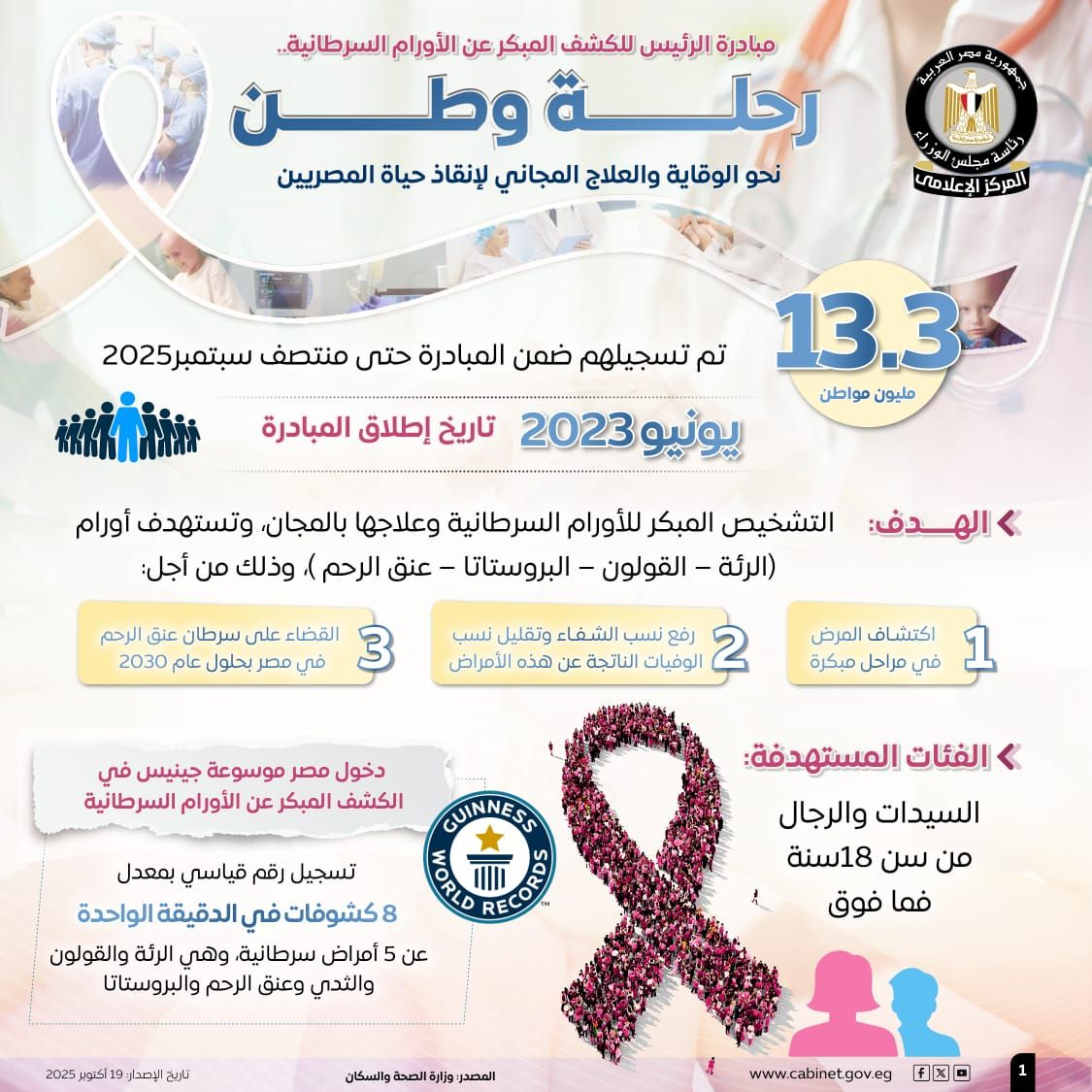 وأوضحت الإنفوجرافات، أن المبادرة تستهدف السيدات والرجال من سن 18 سنة فأكثر، حيث سجل نحو 13.3 مليون مواطن ضمن مبادرة الرئيس للكشف المبكر عن الأورام السرطانية حتى منتصف سبتمبر 2025.