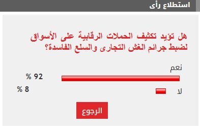 في استطلاع للرأي طرحه "اليوم السابع" على قرائه الأعزاء تحت عنوان هل تؤيد مطالب تكثيف حملات الرقابة على الأسواق لمواجهة الغش التجارى، أيد غالبية القراء مطالب تكثيف حملات الرقابة على الأسواق لمواجهة الغش التجارى.
