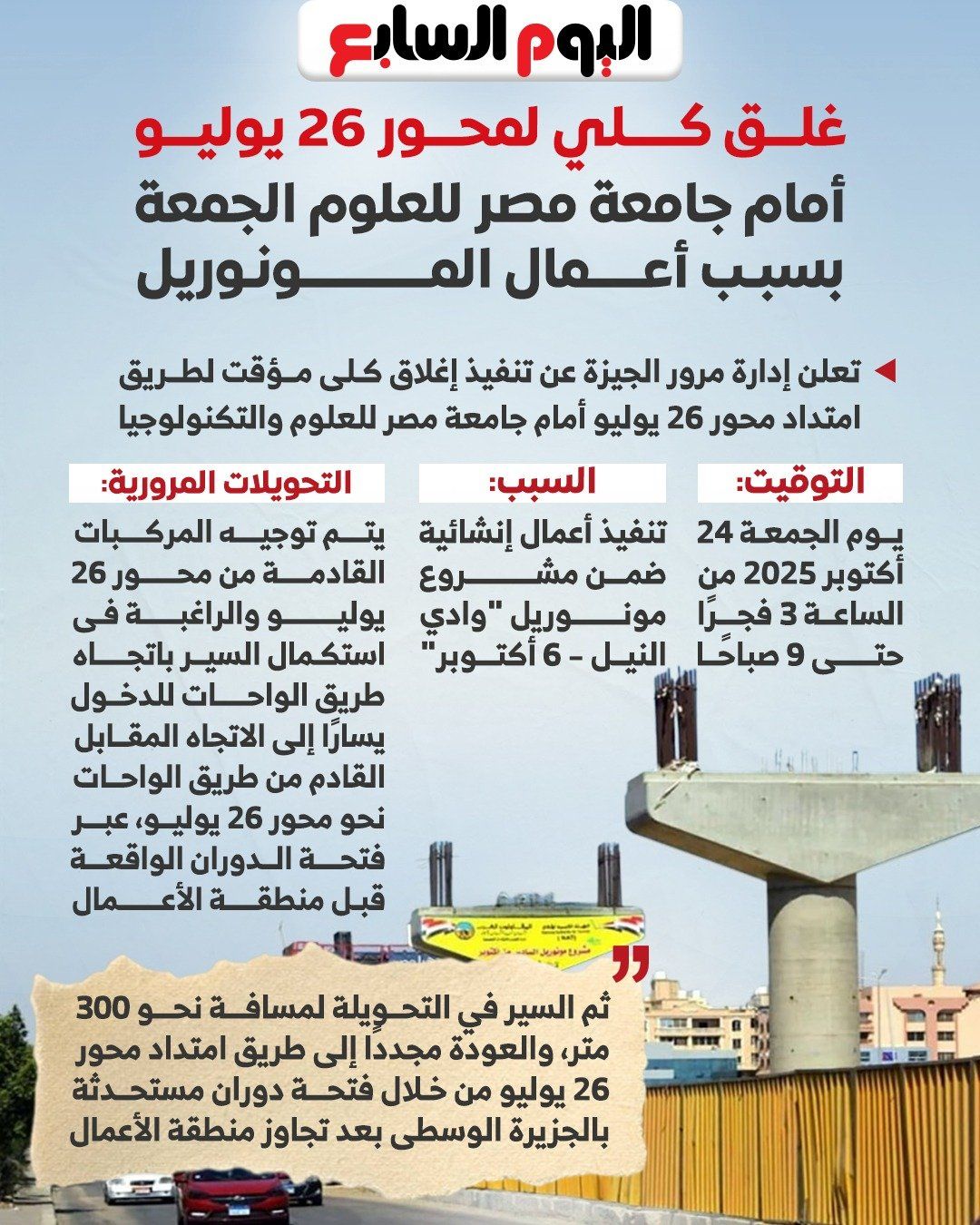 الخميس، 23 أكتوبر 2025 10:08 متنفذ الإدارة العامة لمرور الجيزة إغلاقا كليا مؤقتا لطريق امتداد محور 26 يوليو أمام جامعة مصر للعلوم والتكنولوجيا، وذلك يوم الجمعة الموافق 24 أكتوبر 2025، من الساعة الثالثة فجرًا حتى التاسعة صباحًا، بهدف تنفيذ أعمال إنشائية ضمن مشروع مونوريل وادي النيل – 6 أكتوبر، والمتعلقة برفع كوبري المشاة الخاص بمحطة مونوريل جامعة النيل.