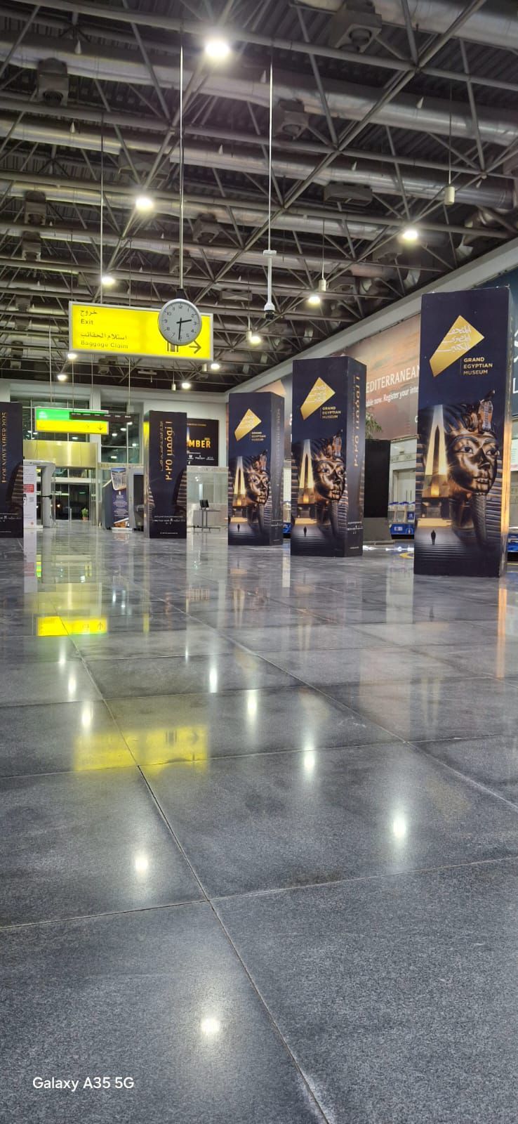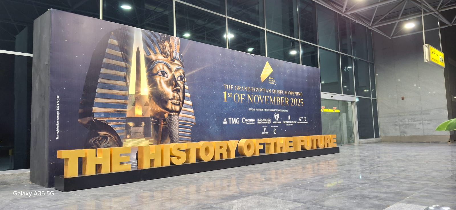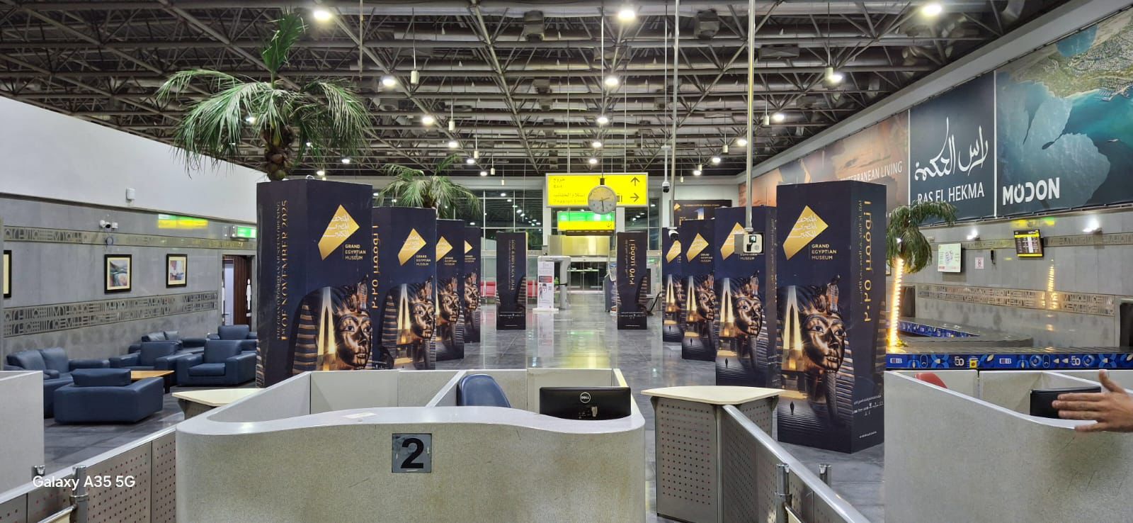 أظهرت الفيديوهات تجهيز صالة (4) المخصصة للطائرات الخاصة وكبار الشخصيات، حيث تم تنفيذ مظاهر احتفالية وزخارف بصرية تحمل صورًا للكنوز الأثرية المعروضة بالمتحف المصري الكبير، إلى جانب اللافتات الترويجية التي تعكس روح الحدث الحضاري المنتظر.