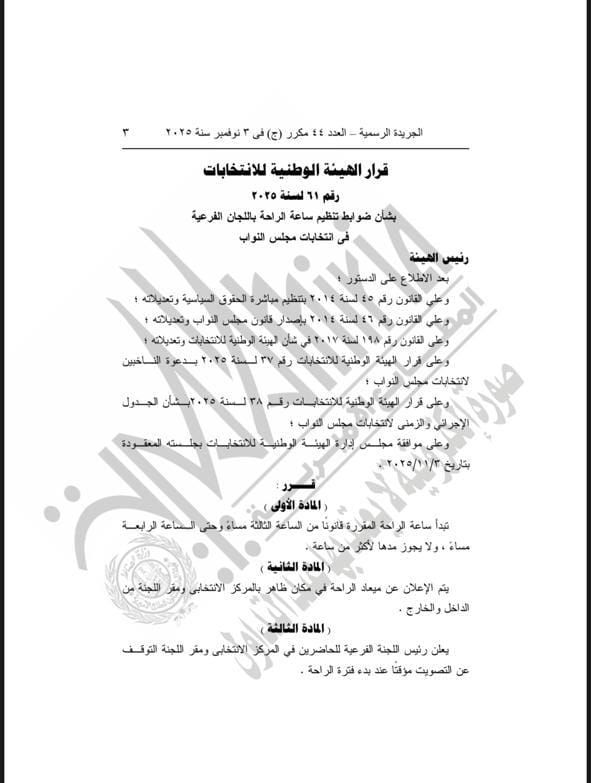 الثلاثاء، 04 نوفمبر 2025 04:36 مأصدرت الهيئة الوطنية للانتخابات برئاسة القاضي حازم بدوي، قرار بشأن الراحة المقررة قانونًا في انتخابات مجلس النواب 2025، والتي حددت من الساعة الثالثة وحتي الرابعة مساءًا.