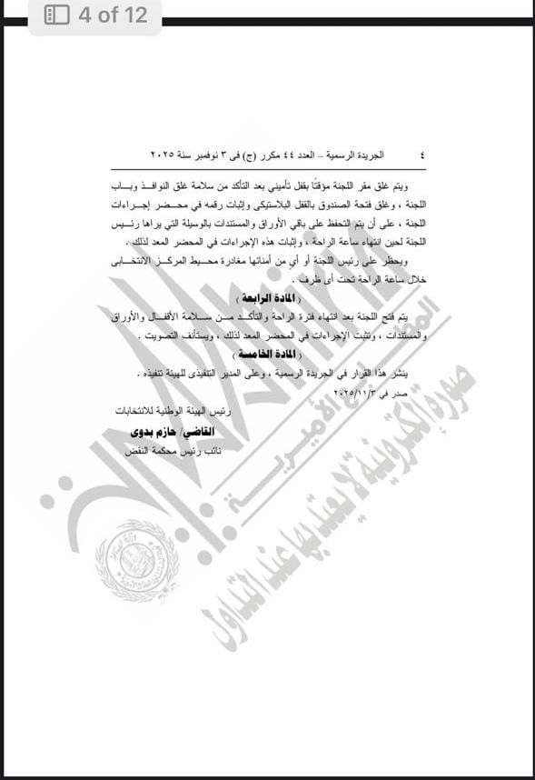 ونص القرار الذي نشرته الهيئة الوطنية للانتخابات بالجريدة الرسمية علي التالي: