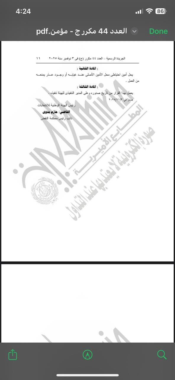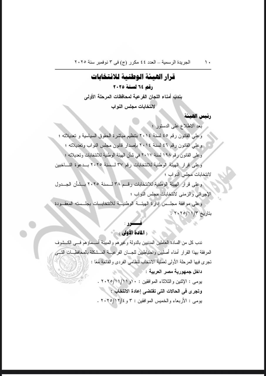 ونص القرار الذي نشرته الهيئة الوطنية للانتخابات بالجريدة الرسمية علي التالي:
