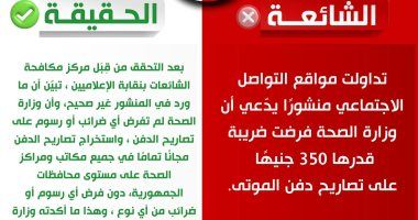 وتبين بعد التحقق من قِبَل مركز مكافحة الشائعات بنقابة الإعلاميين، أن ما ورد في المنشور غير صحيح، وأن وزارة الصحة لم تفرض أي ضرائب أو رسوم على تصاريح الدفن، واستخراج تصاريح الدفن مجانًا تمامًا في جميع مكاتب ومراكز الصحة على مستوى محافظات الجمهورية، دون فرض أي رسوم أو ضرائب من أي نوع ، وهذا ما أكدته وزارة الصحة والسكان.