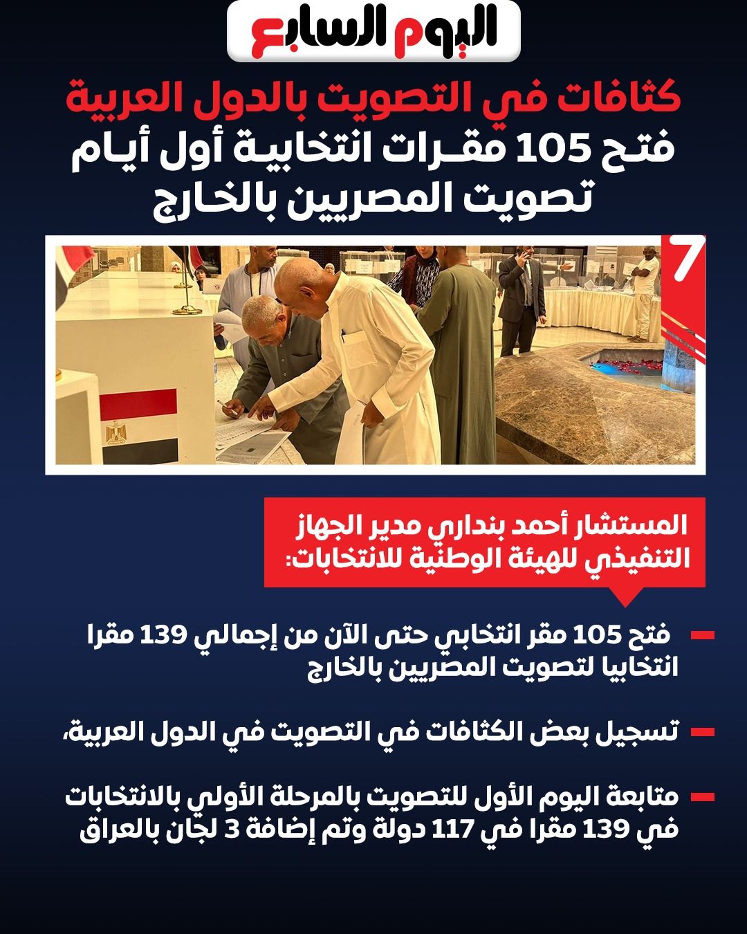 وأوضح القاضي أحمد بنداري إنه سيتم متابعة اليوم الأول للتصويت بالمرحلة الأولي من انتخابات مجلس النواب في 139 مقر في 117 دولة وتم اضافة 3 لجان في دولة العراق.