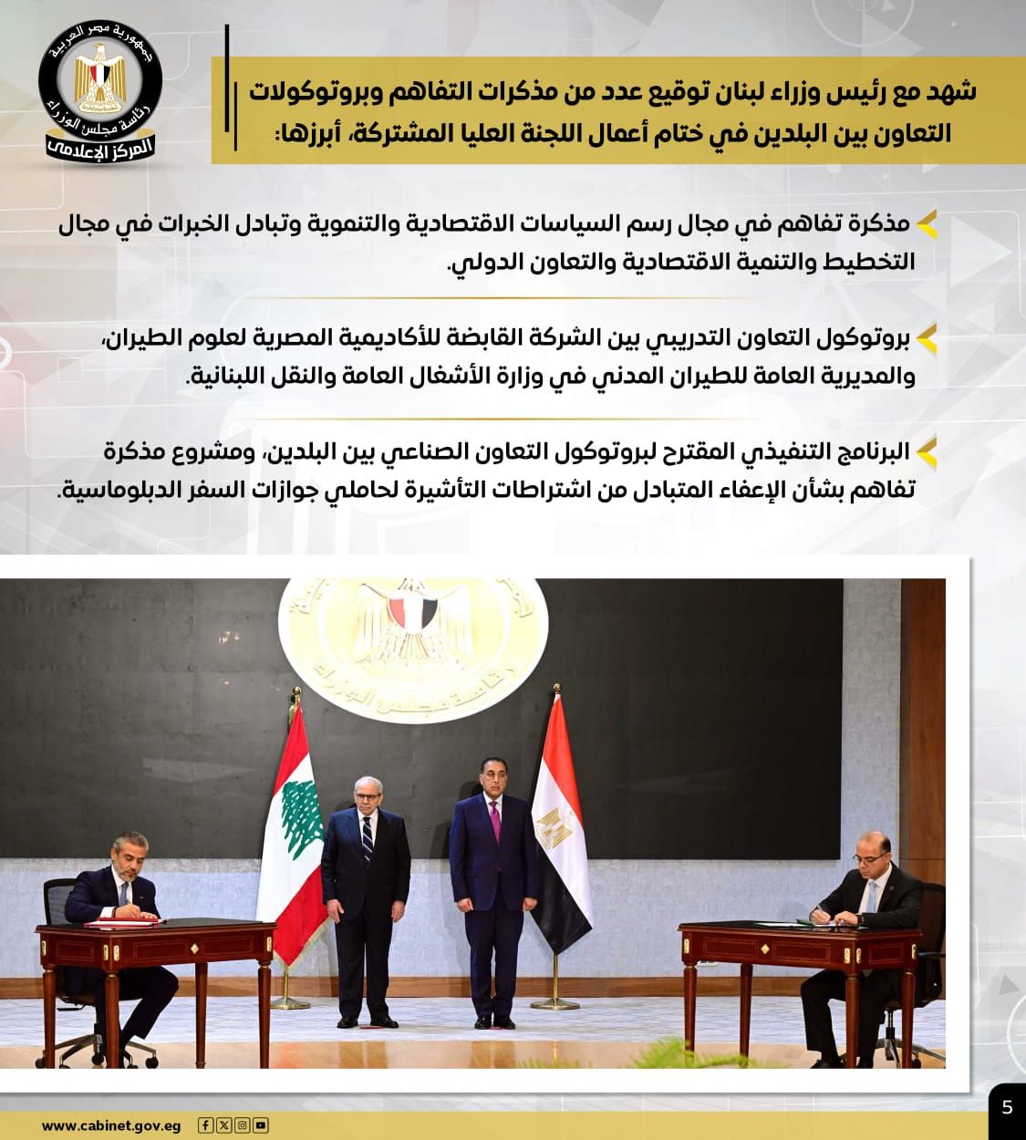 كما ترأس سيادته ونظيره اللبناني اجتماع اللجنة العليا المصرية اللبنانية المشتركة لاستعراض ملفات التعاون المشترك، مشيرًا إلى توجيه فخامة الرئيس بتقديم الدعم للحكومة اللبنانية، مؤكدًا دعم مصر للجهود السياسية والدبلوماسية لتحقيق الاستقرار في لبنان، ونوه سيادته خلال مؤتمر صحفي إلى استعداد الشركات المصرية للمشاركة في مجالات التنمية والتشييد بلبنان.