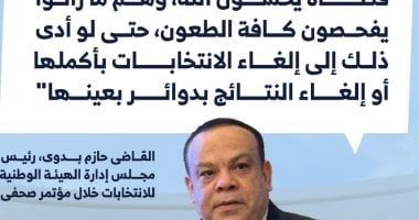 الإثنين، 17 نوفمبر 2025 07:23 مأكد القاضي حازم بدوى، رئيس مجلس إدارة الهيئة الوطنية للانتخابات، "أن الهيئة ليست بمنأى عن كافة الأحداث التي وقعت فى العملية الانتخابية ولا يوجد لديها ما تخفيه، وهم قضاة يخشون اللّه، وهم ما زالوا يفحصون كافة الطعون، حتى لو أدى ذلك إلى إلغاء الانتخابات بأكملها أو إلغاء النتائج بدوائر بعينها".