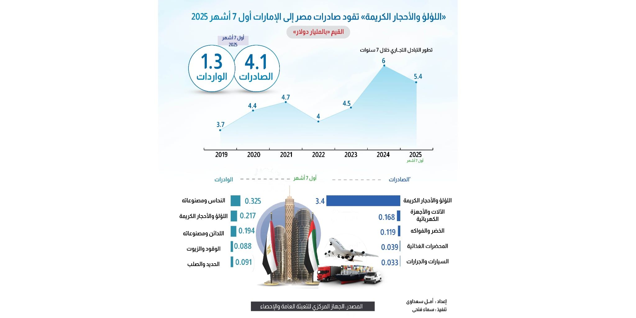 كشفت بيانات الجهاز المركزي للتعبئة العامة والإحصاء أن حجم التبادل التجاري بين مصر والإمارات بلغ نحو 5.4 مليار دولار خلال أول سبعة أشهر من عام 2025، مقابل 6 مليارات دولار خلال عام 2024.