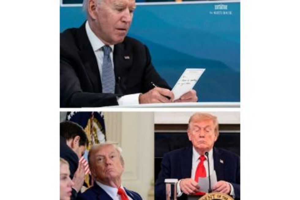 وعرض البيت الأبيض مقارنة بين الرئيسين، في منشور على منصة «إكس» حيث إنه في ورقة «ترامب» كُتب: «قريبون من وقف لإطلاق النار في غزة»، بينما ورقة بايدن: «هناك شيء على ذقنك».