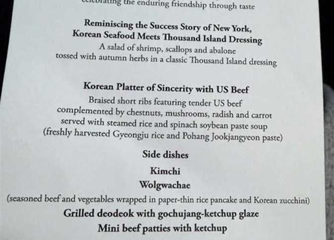 وشملت القائمة «فطائر لحم البقر الصغيرة مع الكاتشب»، و«طبق الإخلاص الكوري» الذي يضم لحم بقر أمريكي وأرز محلي ومعجون فول الصويا، وسمك مشوي بصلصة من الكاتشب و«الجوتشوجانج- معجون الفلفل الحار الأحمر»، فيما تُوّج الغداء بـ«حلوى صانع السلام»، وهي كعكة «براوني» مزينة بالذهب.