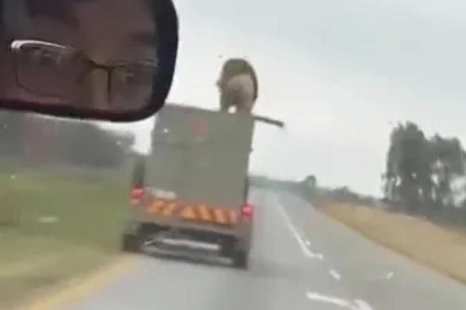 وثقت جنوب إفريقية لحظة هروب أسد من شاحنة نقل عبر فتحة السقف، أثناء قيادتها على الطريق R49 بالقرب من بلدة باكيرفيل، بين مدينتي ليشتنبرغ وزيروست، عندما توقفت الشاحنة على جانب الطريق، ليقفز الأسد منها ويواصل سيره على الطريق، قبل أن يتم ضبطه ونقله مجدداً إلى وجهته.
