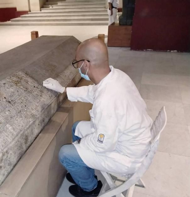 ترميم تابوت أثرى من الحجر الجيري بالمتحف المصري