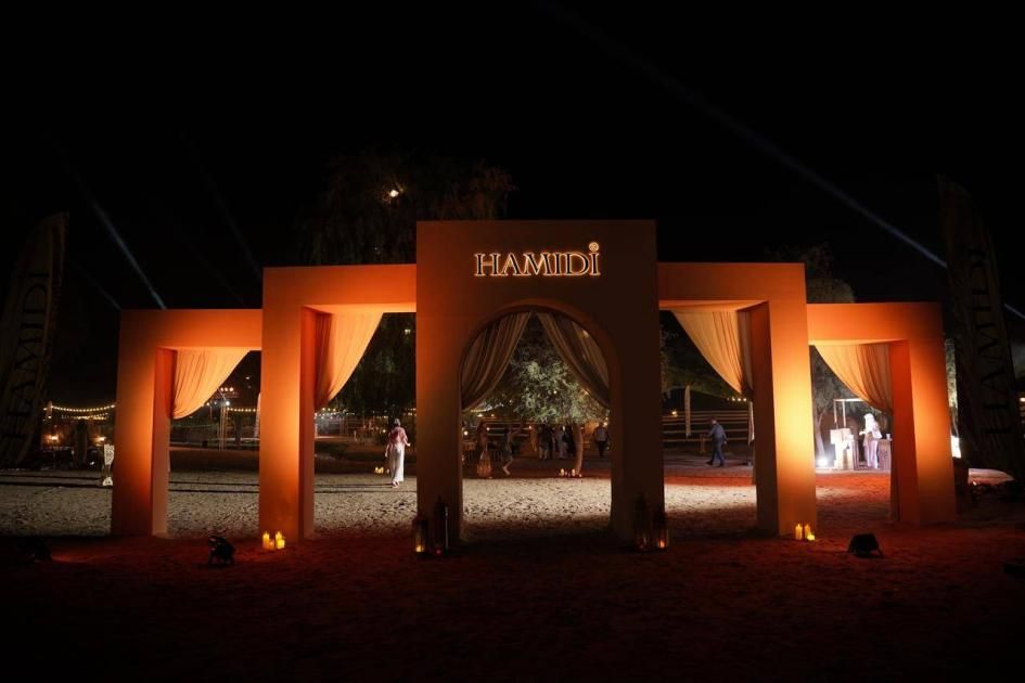 الأمسية نظمتها حامِدي، دار الفخامة الشرقية التابعة لشركة «ستيرلينغ بيرفيومز إندستريز ش.ذ.م.م»، وتجلّت في ثلاثة فصول رمزية، فبدأ الضيوف بالدخول عبر أقواس من العاج والرمال تصطف على جانبيها الفوانيس النحاسية وعبير البخور، حيث اُستقبلوا بماء الورد والقهوة العربية والحلويات التقليدية في تجسيد خالد لدفء الضيافة العربية.
