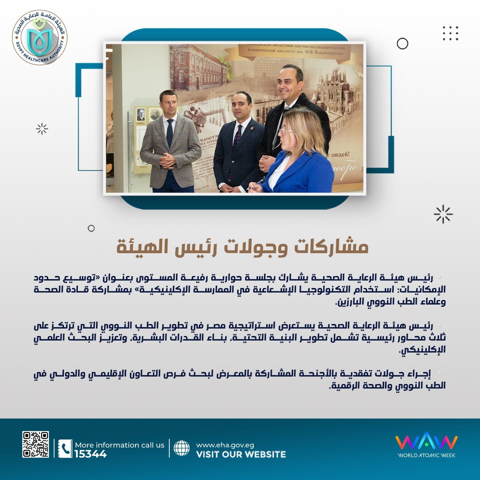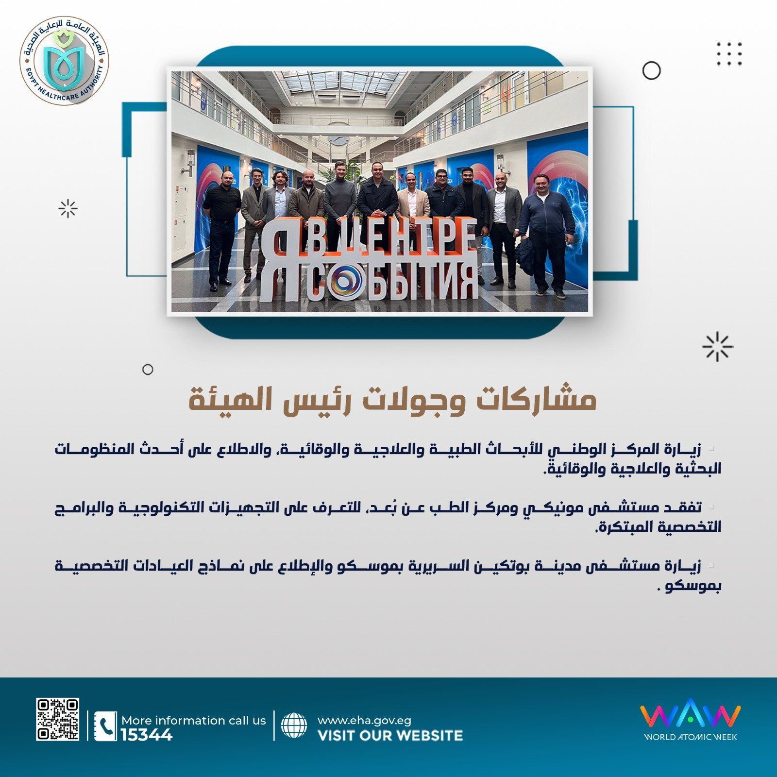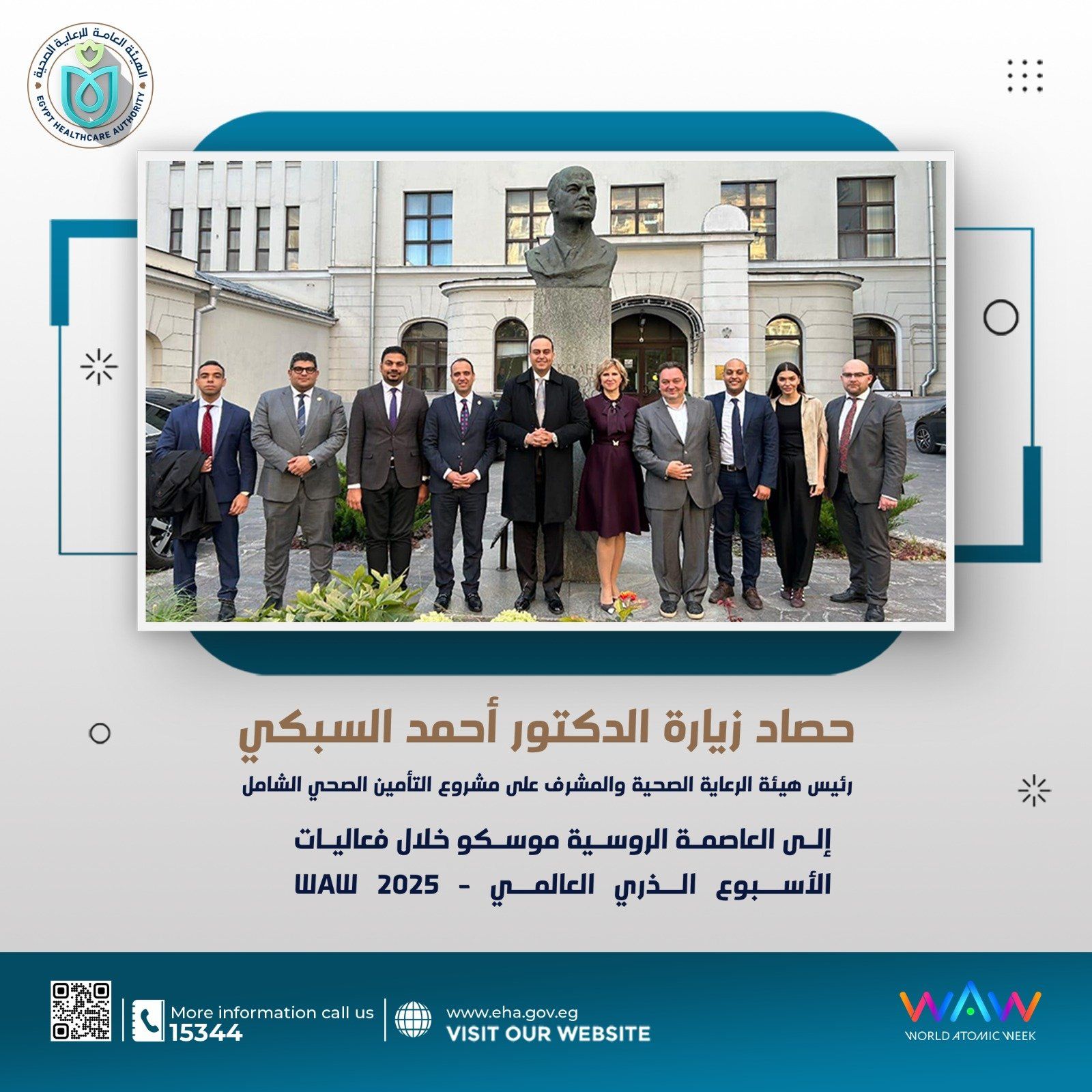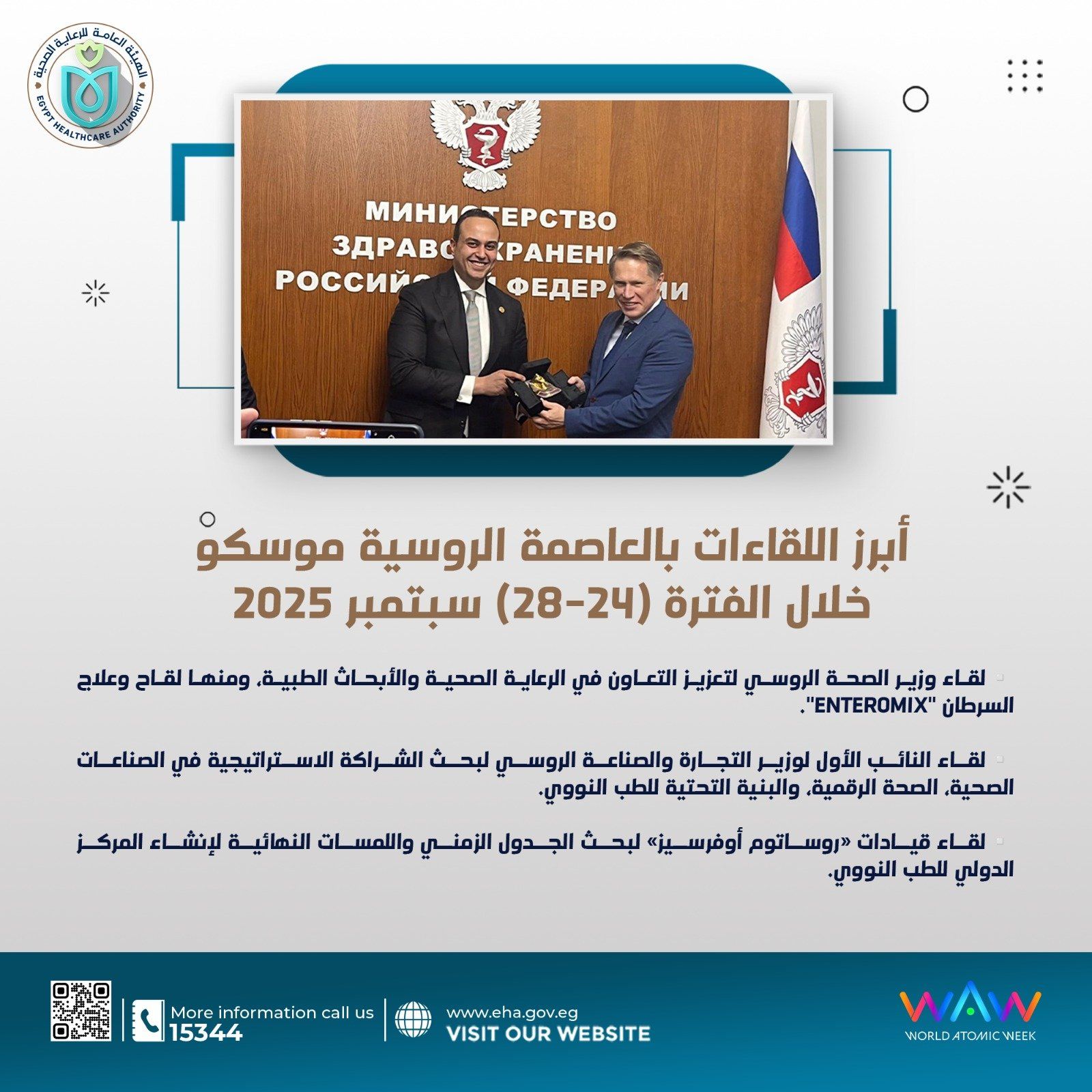 أصدرت الهيئة العامة للرعاية الصحية إنفوجراف يوضح أبرز محطات زيارة الدكتور أحمد السبكي، رئيس الهيئة العامة للرعاية الصحية والمشرف العام على مشروع التأمين الصحي الشامل، إلى العاصمة الروسية موسكو، وذلك خلال مشاركته في فعاليات الأسبوع الذري العالمي (WAW 2025)، والذي عُقد في الفترة من 25 حتى 28 سبتمبر الجاري.