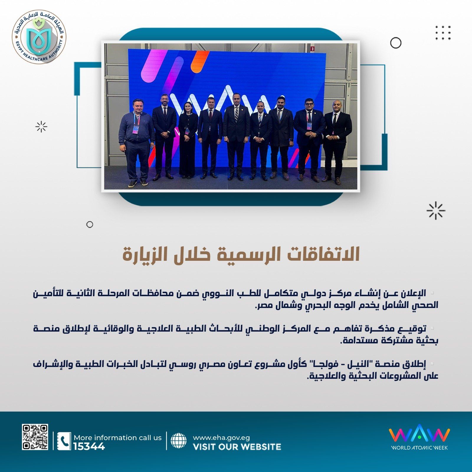 كما شهدت الزيارة الإعلان عن مجموعة من الاتفاقات المهمة، تضمنت إنشاء مركز دولي متكامل للطب النووي والعلاج الإشعاعي ضمن محافظات المرحلة الثانية للتأمين الصحي الشامل لخدمة محافظات الوجه البحري وشمال ، إلى جانب توقيع مذكرة تفاهم مع المركز الوطني للأبحاث الطبية العلاجية والوقائية لإطلاق منصة بحثية مشتركة مستدامة، فضلًا عن إطلاق منصة "النيل – فولجا" كأول مشروع تعاون مصري–روسي في مجال تبادل الخبرات الطبية والإشراف على المشروعات البحثية والعلاجية.