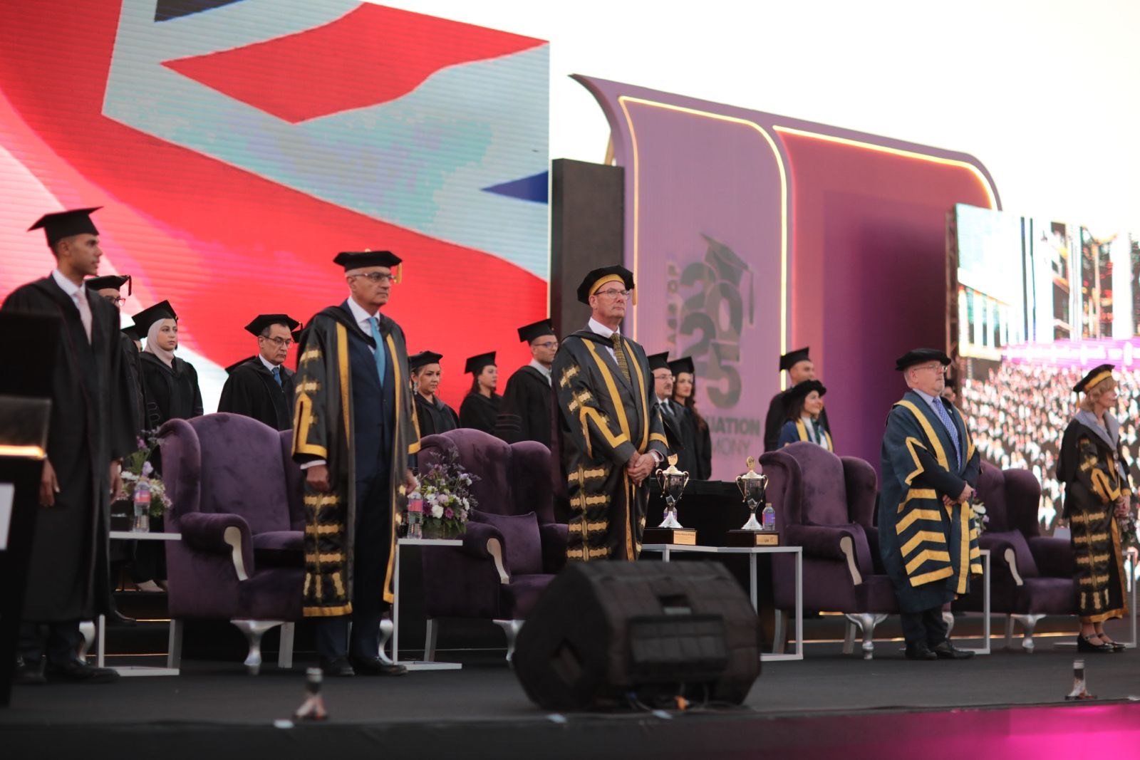 شهد حفل التخريج حضوراً رفيع المستوى ضم الدكتور عبد الوهاب عزت، أمين مجلس الجامعات الخاصة وأفرع الجامعات الأجنبية، مارك هوارد، المدير الإقليمى للمجلس الثقافي البريطاني في ، ورئيس الجامعة بإنجلترا ، البروفسورأنتوني وودمان، واللواء مهندس دكتور أحمد فهمي فرج، مدير عام شركة العاصمة الإدارية، إلى جانب عدد من العمداء وكبار المسؤولين الأكاديميين، بالإضافة إلى نخبة من الشخصيات البارزة من الأوساط الأكاديمية والحكومية.