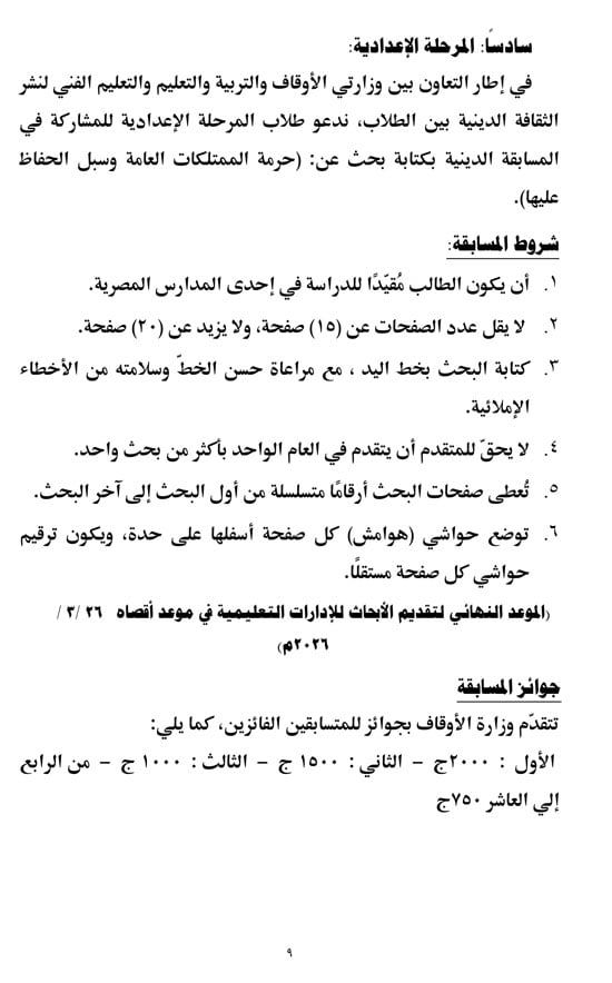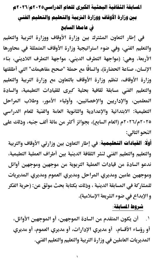أعلنت وزارة الأوقاف، بالتعاون مع وزارة التربية والتعليم والتعليم الفني، عن انطلاق المسابقة الثقافية البحثية الكبرى في عامها السابع للعام الدراسي 2026/2025م، وذلك في إطار الشراكة المثمرة بين الوزارتين، وحرصهما على ترسيخ القيم الدينية والوطنية في نفوس الطلاب والمجتمع التعليمي.