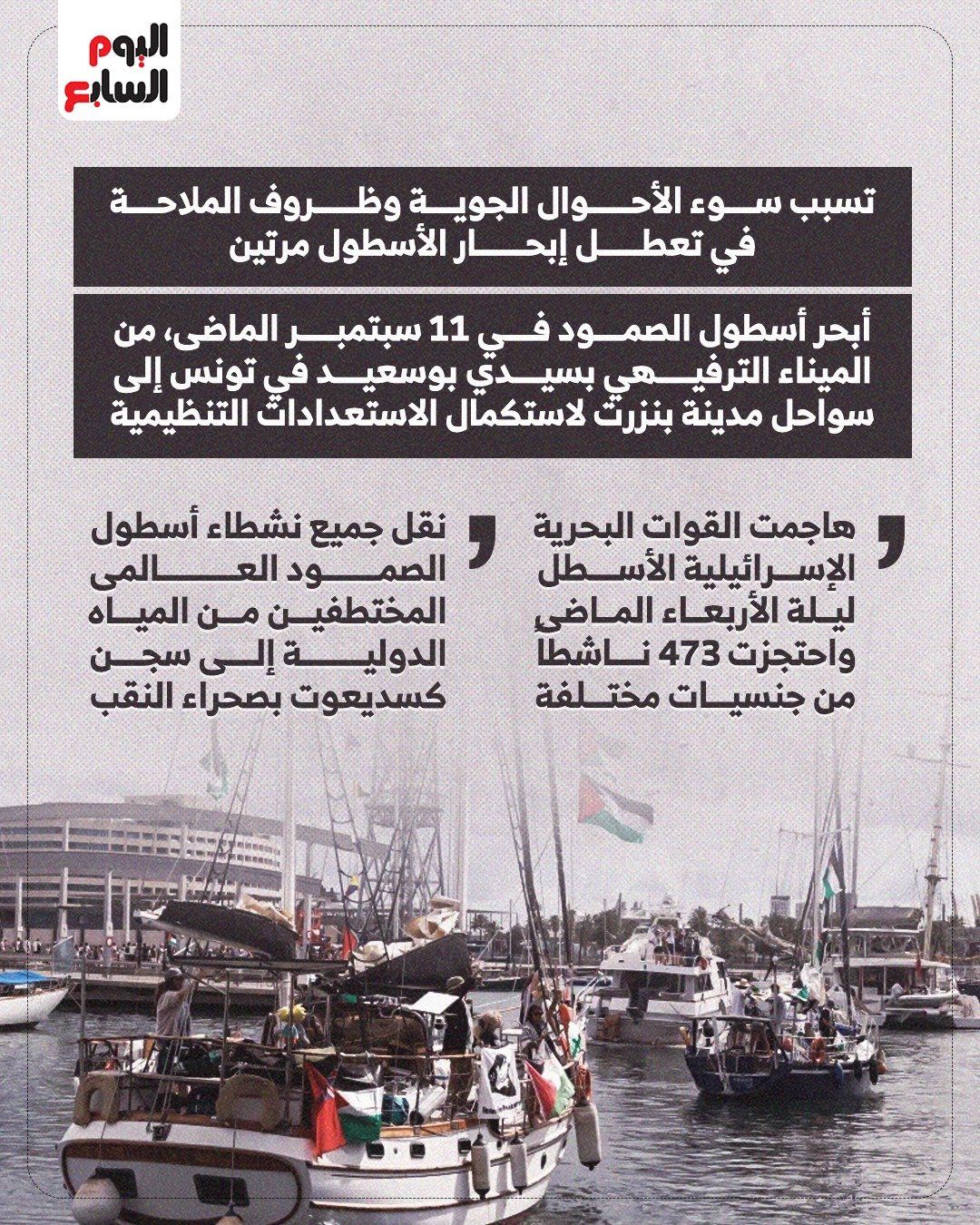وفي 11 سبتمبر الماضي، أبحر الأسطول من الميناء الترفيهي بسيدي بوسعيد في تونس باتجاه سواحل مدينة بنزرت لاستكمال الاستعدادات التنظيمية، قبل أن يتجه إلى شرق المتوسط في طريقه إلى غزة.