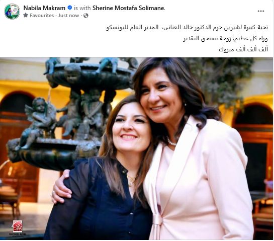 وكتبت السفيرة نبيلة مكرم فى تدوينة على صفحتها قائلة: "تحية كبيرة لشيرين حرم الدكتور خالد العنانى المدير العام لليونسكو.. وراء كل عظيم زوجة تستحق التقدير".
