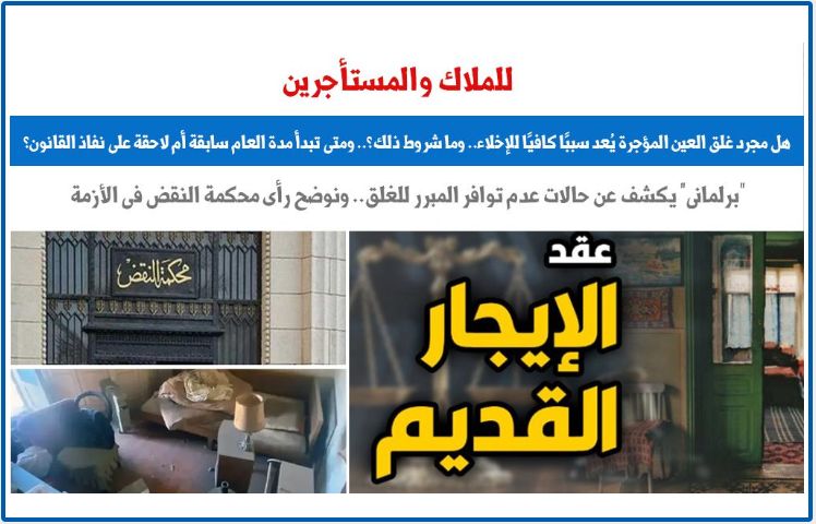 في التقرير التالى، نلقى الضوء على حزمة من الأسئلة بشأن إشكالية غلق العين كسبب من أسباب الإخلاء والطرد، أبرزها.. هل مجرد غلق العين المؤجرة كافيا بمفرده كسبب للإخلاء؟ وما شروط ذلك ومتى تبدأ مدة العام سابقة أم لاحقة على نفاذ القانون؟ وما حالات عدم توافر المبرر للغلق؟ وإنهاء العلاقة الإيجارية وفسخ عقد الإيجار، وذلك فى الوقت الذى يصف فيه المراقبون مجرد مناقشة - قانون الإيجار القديم - بمثابة الخوض في حقل ألغام، كونه يتناول شأن ملايين من الأسر المصرية، ولكن ترك الأمر على ما هو عليه يزيد من حدة تفاقم المشكلة.
