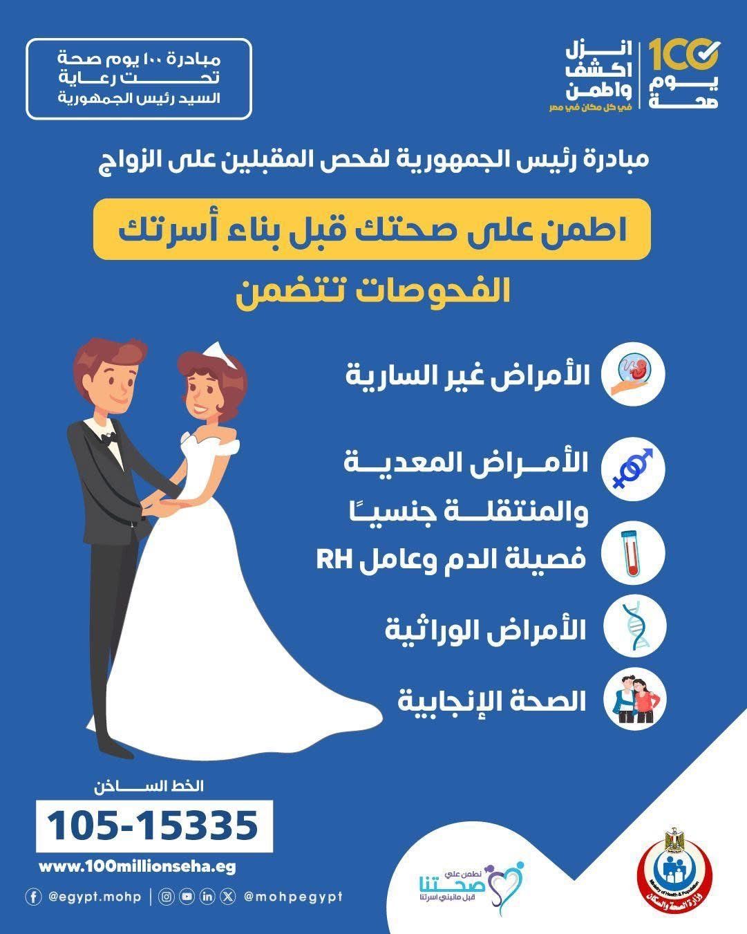 الجمعة، 10 أكتوبر 2025 08:00 مقالت وزارة الصحة والسكان إن مبادرة رئيس الجمهورية لفحص المقبلين على الزواج تتضمن مجموعة من الفحوصات والتحاليل الهامة والتى تقدم بالمجان.