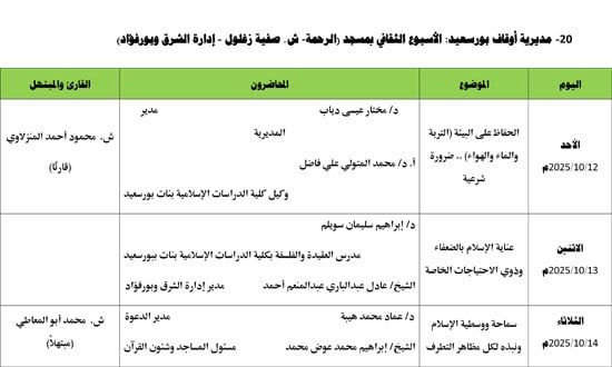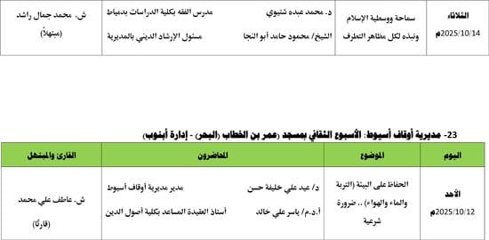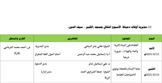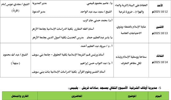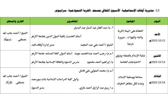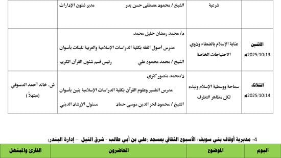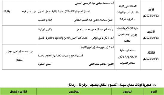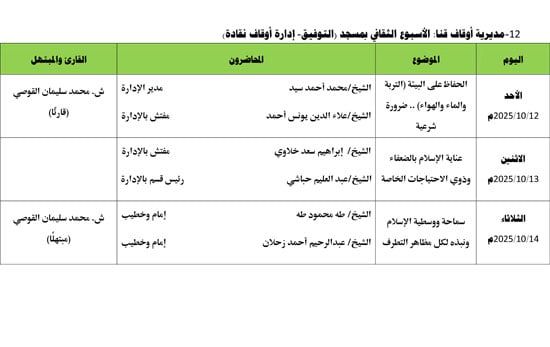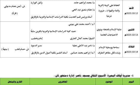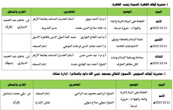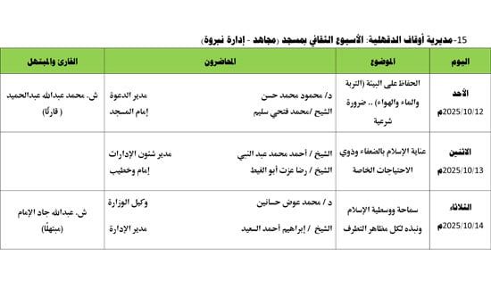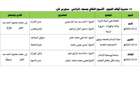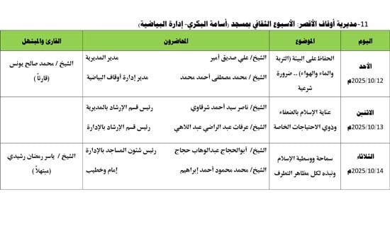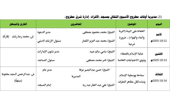 تعقد وزارة الأوقاف الأسبوع الثقافي بجميع المديريات بعدد (27) مسجدًا، وذلك في الفترة غدا الأحد وحتى يوم الثلاثاء 14 أكتوبر 2025 م، عقب صلاة المغرب، ضمن فعاليات مبادرة "صحح مفاهيمك" التي تنفذها الوزارة في مختلف محافظات الجمهورية.