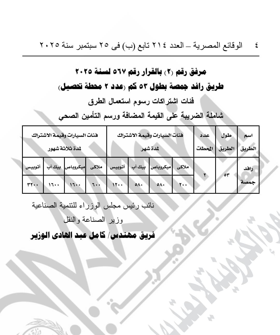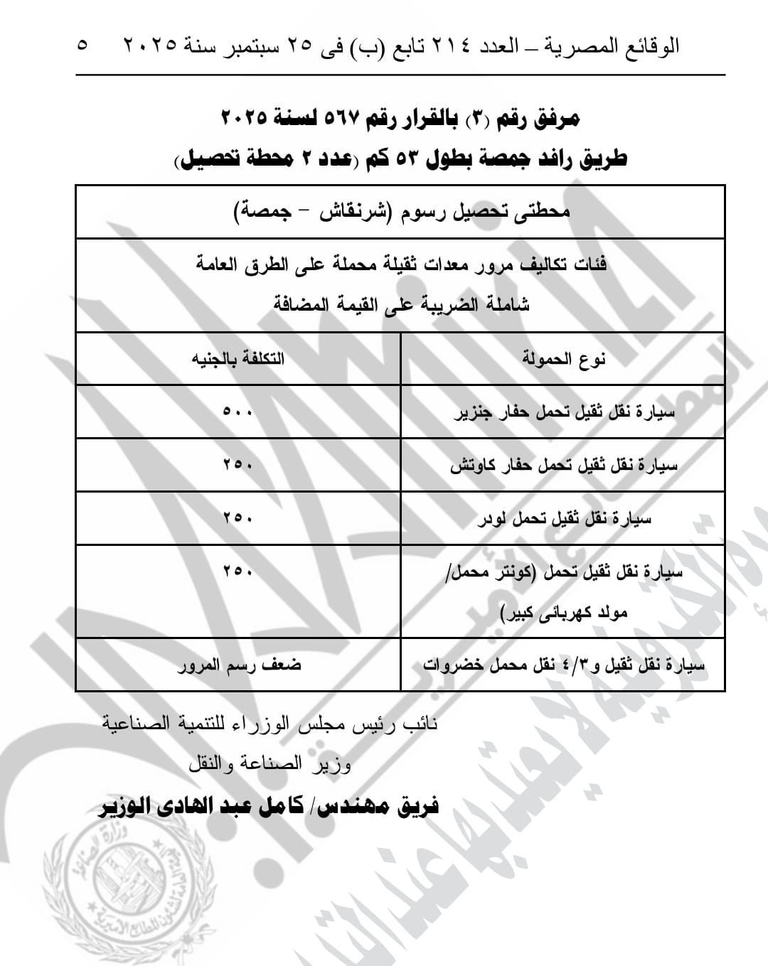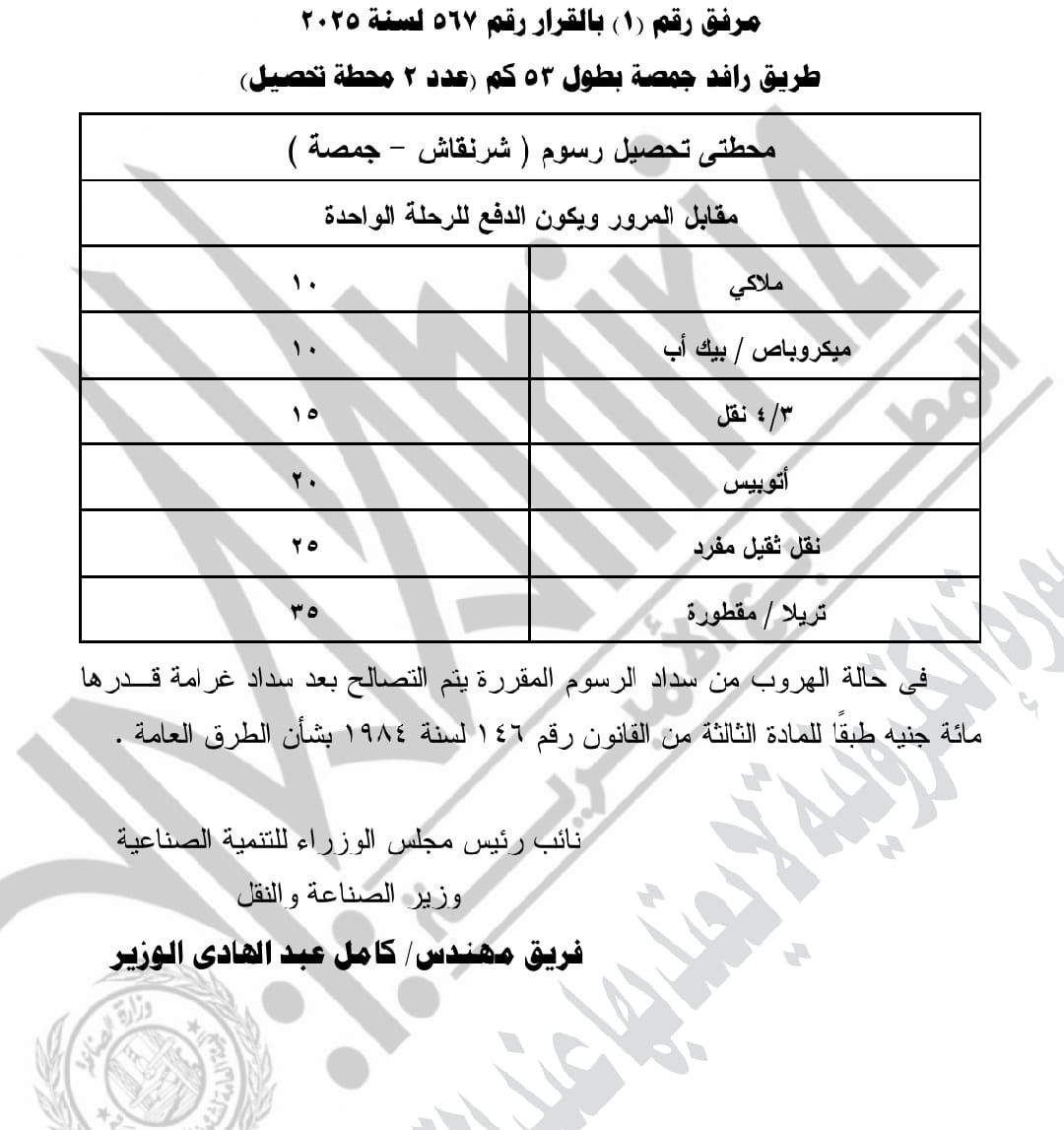 الأحد، 12 أكتوبر 2025 01:18 منشرت الجريدة الرسمية فى عددها اليوم قرار الفريق مهندس كامل الوزير نائب رئيس مجلس الوزراء للتنمية الصناعية وزير الصناعة والنقل، بتحصيل رسم استعمال مرور السيارات على طريق رافد جمصه بطـول 53 كم (عدد اثنين محطة لتحصيل الرسوم.