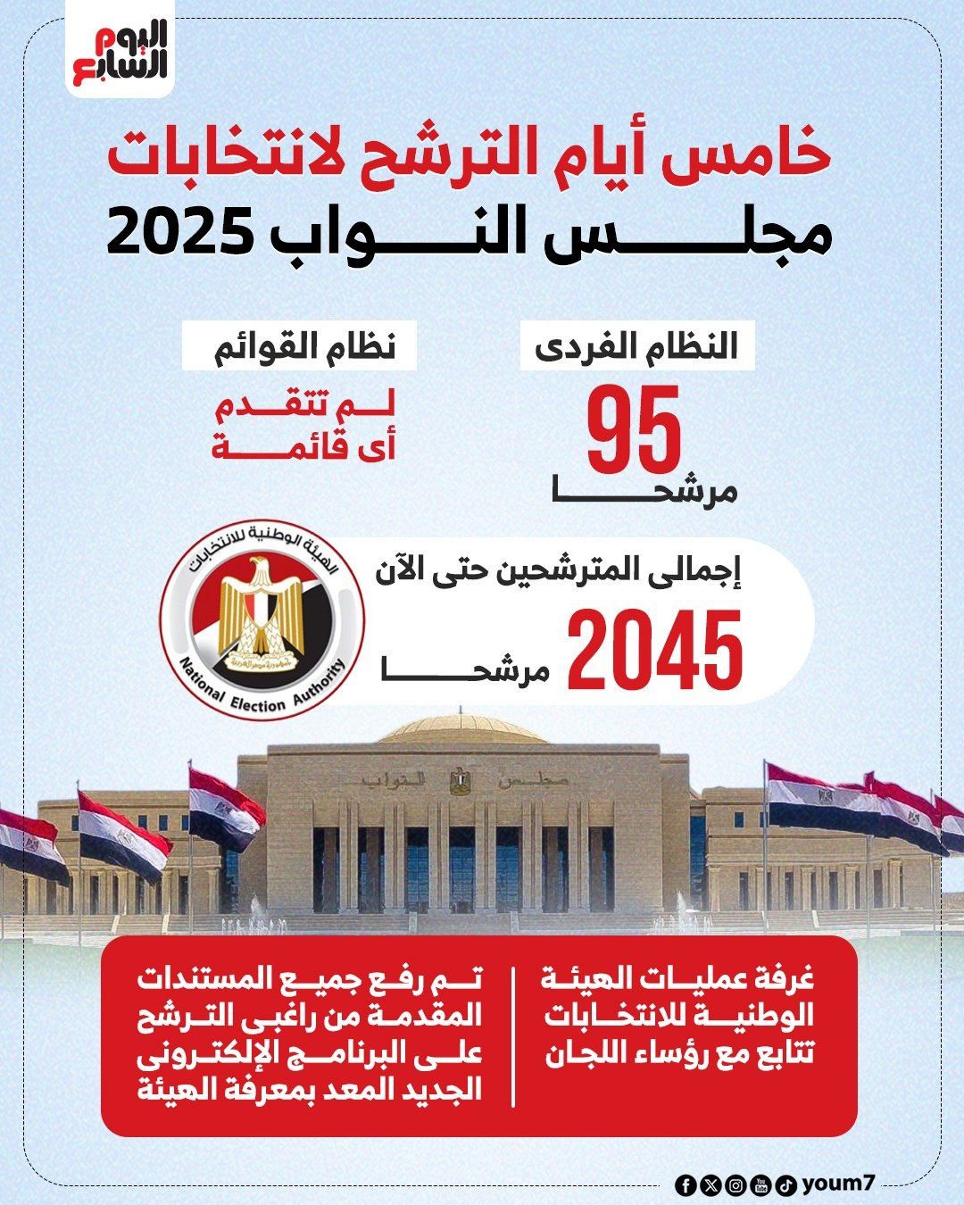 الأحد، 12 أكتوبر 2025 08:58 مأعلن القاضي حازم بدوي رئيس الهيئة الوطنية للانتخابات، ارتفاع عدد من تقدموا بأوراق ترشحهم لانتخابات مجلس النواب، إلى 2044 مرشحا وذلك على مدار 5 أيام متواصلة، وفيما يلي المرشحين في خامس أيام الترشح لانتخابات مجلس النواب.