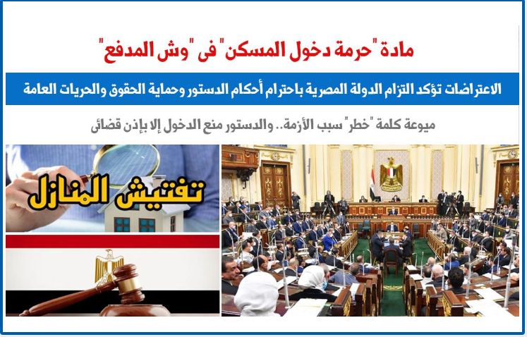 مادة "حرمة دخول المسكن" في "وش المدفع".. الاعتراضات تؤكد على التزام الدولة المصرية بإحترام أحكام الدستور وحماية الحقوق والحريات العامة.. وميوعة كلمة "خطر" سبب الأزمة.. والدستور منع الدخول إلا بإذن قضائى