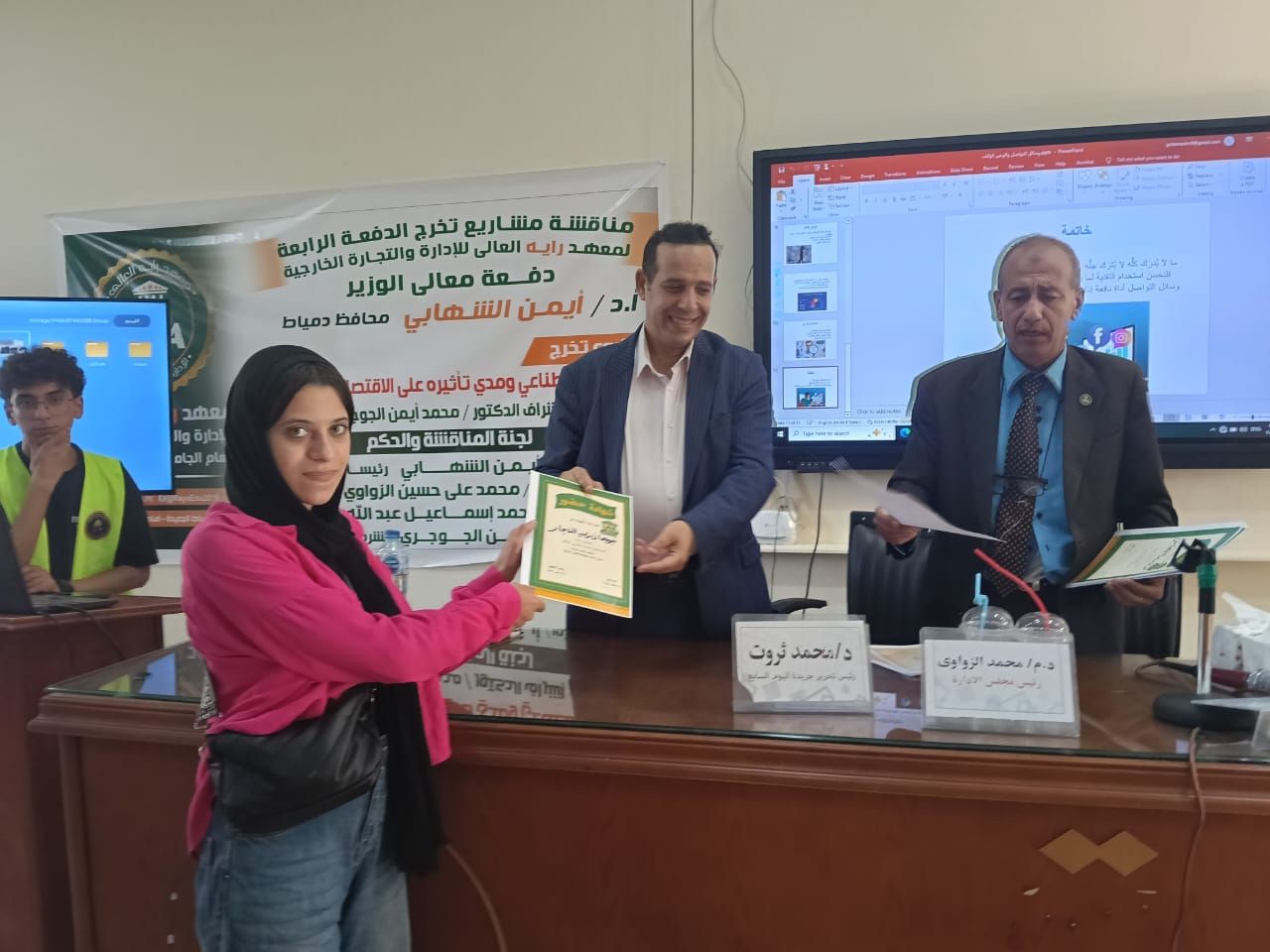 كرم راية العالي للإدارة والتجارة الخارجية بدمياط الجديدة الكاتب الدكتور محمد ثروت أستاذ خبير الإعلام الرقمي، حيث تسلم درع وشهادة التكريم من الدكتور محمد الزواوي رئيس مجلس إدارة المعهد والدكتورة منى عمار عميدة المعهد، وأدار الندوة دكتور نادر مدير رعاية الشباب فى حضور ياسر جميل مسؤول النشاط الثقافي بوزارة التعليم العالى.