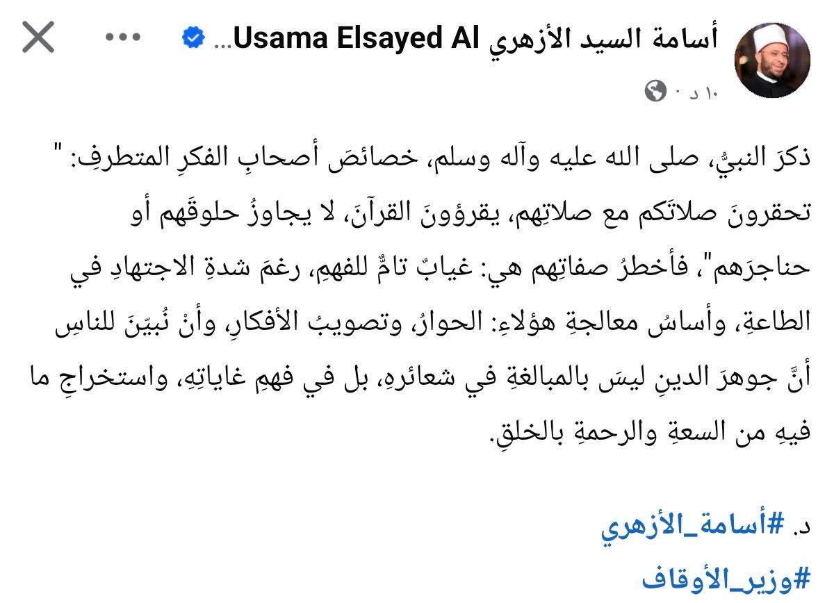 قال الدكتور أسامة الازهرى ، وزير الأوقاف ، لقد ذكرَ النبيُّ، صلى الله عليه وآله وسلم، خصائصَ أصحابِ الفكرِ المتطرفِ: " تحقرونَ صلاتَكم مع صلاتِهم، يقرؤونَ القرآنَ، لا يجاوزُ حلوقَهم أو حناجرَهم"، فأخطرُ صفاتِهم هي: غيابٌ تامٌّ للفهمِ، رغمَ شدةِ الاجتهادِ في الطاعةِ، وأساسُ معالجةِ هؤلاءِ: الحوارُ، وتصويبُ الأفكارِ، وأنْ نُبيّنَ للناسِ أنَّ جوهرَ الدينِ ليسَ بالمبالغةِ في شعائرهِ، بل في فهمِ غاياتِهِ، واستخراجِ ما فيهِ من السعةِ والرحمةِ بالخلقِ.