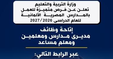 تعلن والتعليم الفنى فتح باب التقديم لوظائف (مديري مدارس – معلمين رياض أطفال – معلم مساعد رياض أطفال) بالمدارس المصرية الألمانية للعام الدراسى 2026 / 2027.