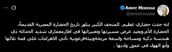 عمرو موسى يهنئ الرئيس السيسى: المتحف الكبير يبلور تاريخ حضارة القديمة