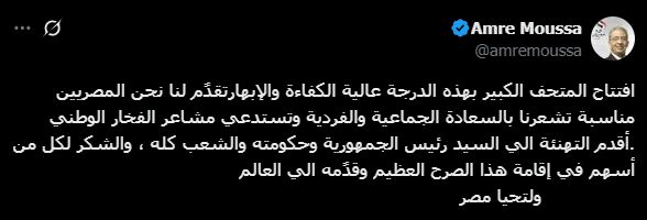 وقال موسى، عبر حسابه على منصة X: "افتتاح المتحف الكبير بهذه الدرجة عالية الكفاءة والإبهار تقدًم لنا نحن المصريين مناسبة تشعرنا بالسعادة الجماعية والفردية وتستدعي مشاعر الفخار الوطني".