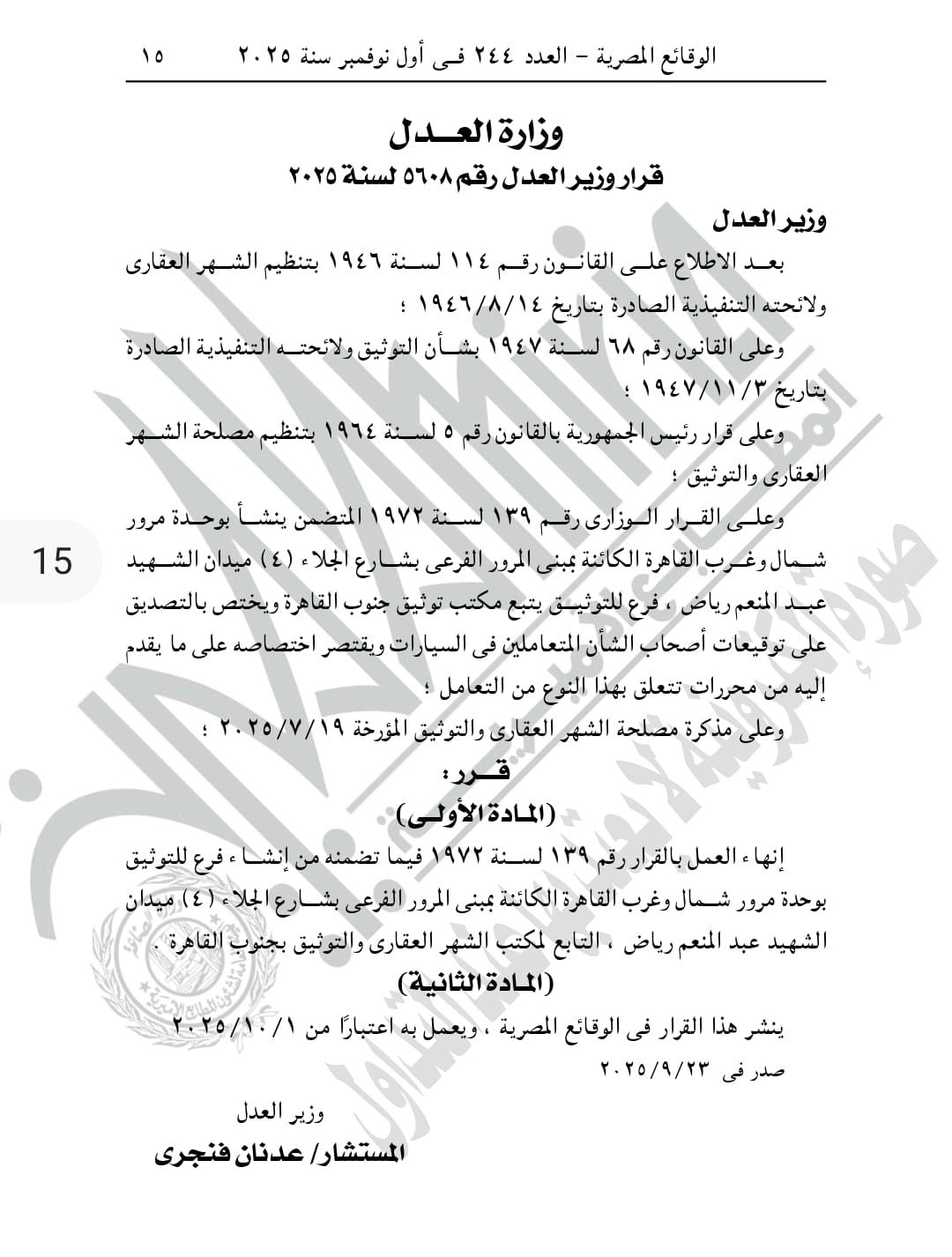 ونشرت الجديدة الرسمية قرار وزير العدل رقم 5608 لسنة 2025، والذى تضمن إنهاء العمل بالقرار رقم 139 لسنة 1972 فيما تضمنه من إنشاء فرع للتوثيق بوحدة مرور شمال وغرب القاهرة الكائنة بمبنى المرور الفرعى بشارع الجلاء (4) ميدان الشهيد عبد المنعم رياض، التابع لمكتب الشهر العقارى والتوثيق بجنوب القاهرة.