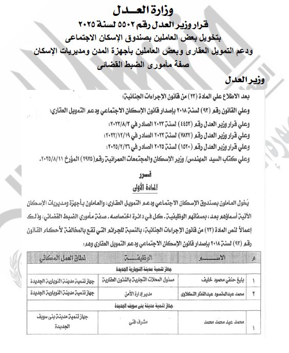 السبت، 01 نوفمبر 2025 01:05 مأصدر المستشار عدنان فنجرى، وزير العدل القرار رقم 5502 لسنة 2025 بمنح بعض العاملين بصندوق الإسكان الاجتماعي ودعم التمويل العقارى وبعض العاملين بأجهزة المدن ومديريات الإسكان صفة مأموري الضبط القضائي.