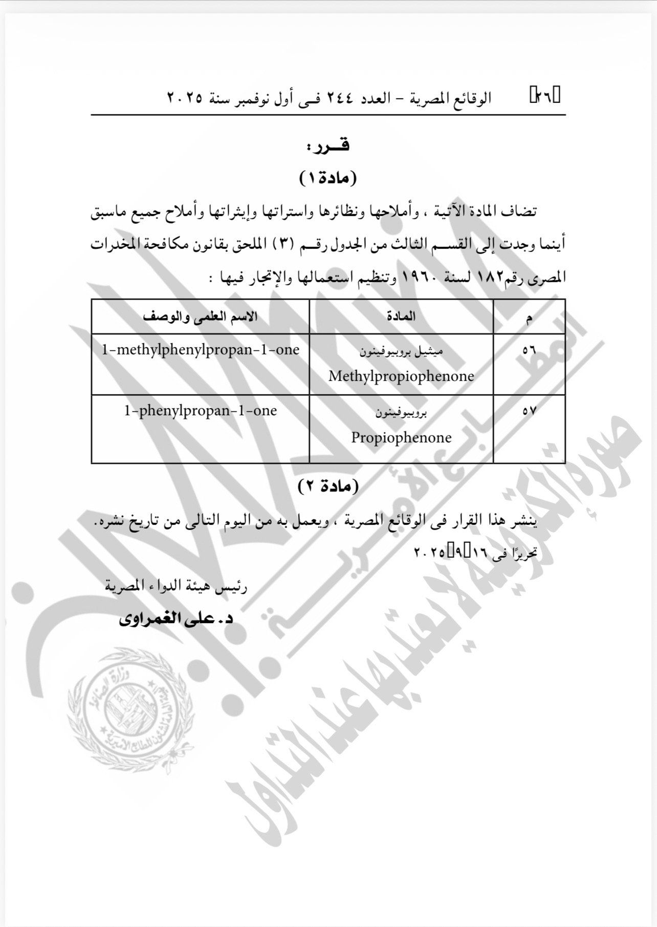 السبت، 01 نوفمبر 2025 01:40 منشرت الجريدة الرسمية في عددها الصادر اليوم القرار رقم 600 لسنة 2025 الصادر عن هيئة الدواء المصرية بشأن اضافة عدد من المواد وأملاحها ونظائرها واستراتها وإيثراتها وأملاح جميع ما سبق أينما وجدت إلي القسم الثالث من الجدول 3 الملحق بقانون مكافحة المخدرات المصرى رقم 182 لسنة 1960 .