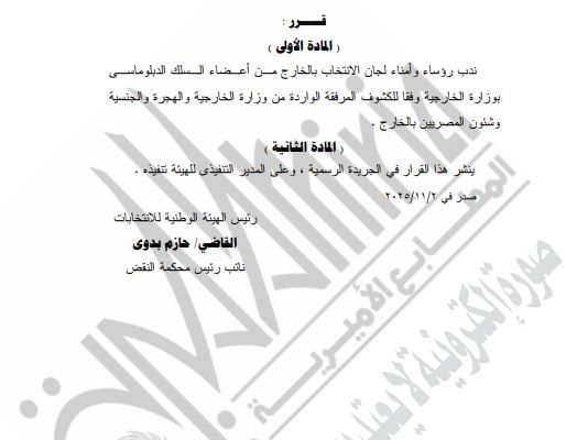 ونشرت الجريدة الرسمية القرار الذى نص على ندب رؤساء وأمناء لجان الانتخاب بالخارج من أعضاء السلك الدبلوماسي بوزارة الخارجية وفقا للكشوف المرفقة الواردة من وزارة الخارجية والهجرة والجنسية وشئون المصريين بالخارج.