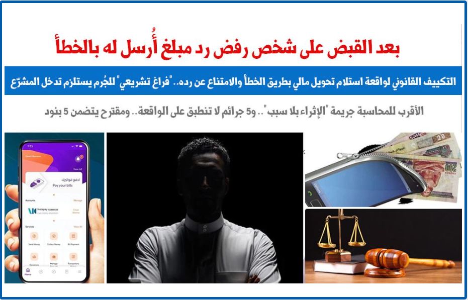 التكييف القانوني لواقعة استلام تحويل مالي بطريق الخطأ والامتناع عن رده.. "فراغ تشريعى" للجُرم يستلزم تدخل المشرع.. والأقرب يكون التكييف "إثراء بلا سبب".. و5 جرائم لا تنطبق على الواقعة.. ومقترح يتضمن 5 بنود