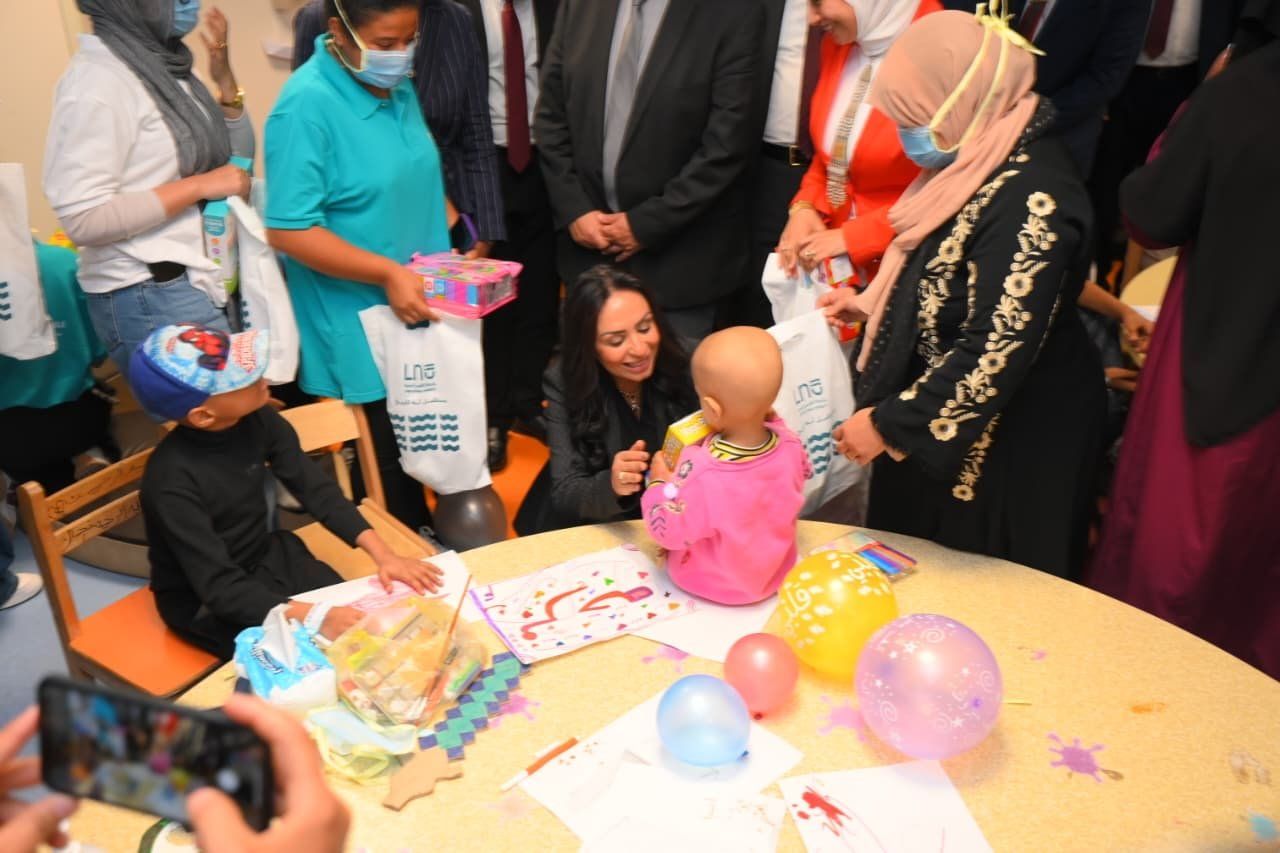 الدكتورة مايا مرسى وزيرة التضامن تسلم طفل هدية خلال زيارة مستشفى الأورمان