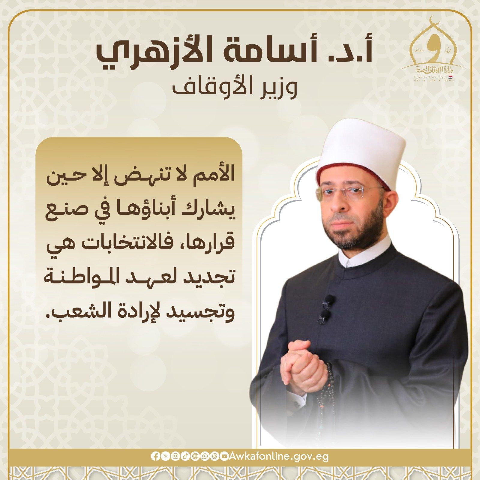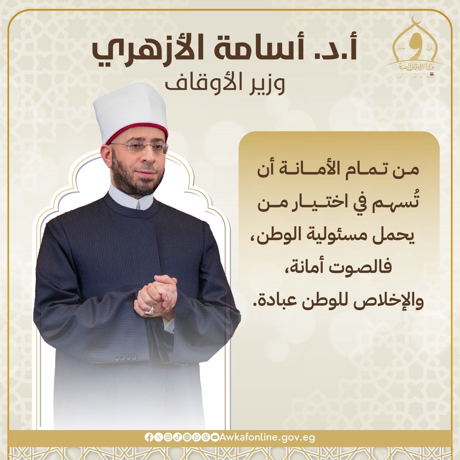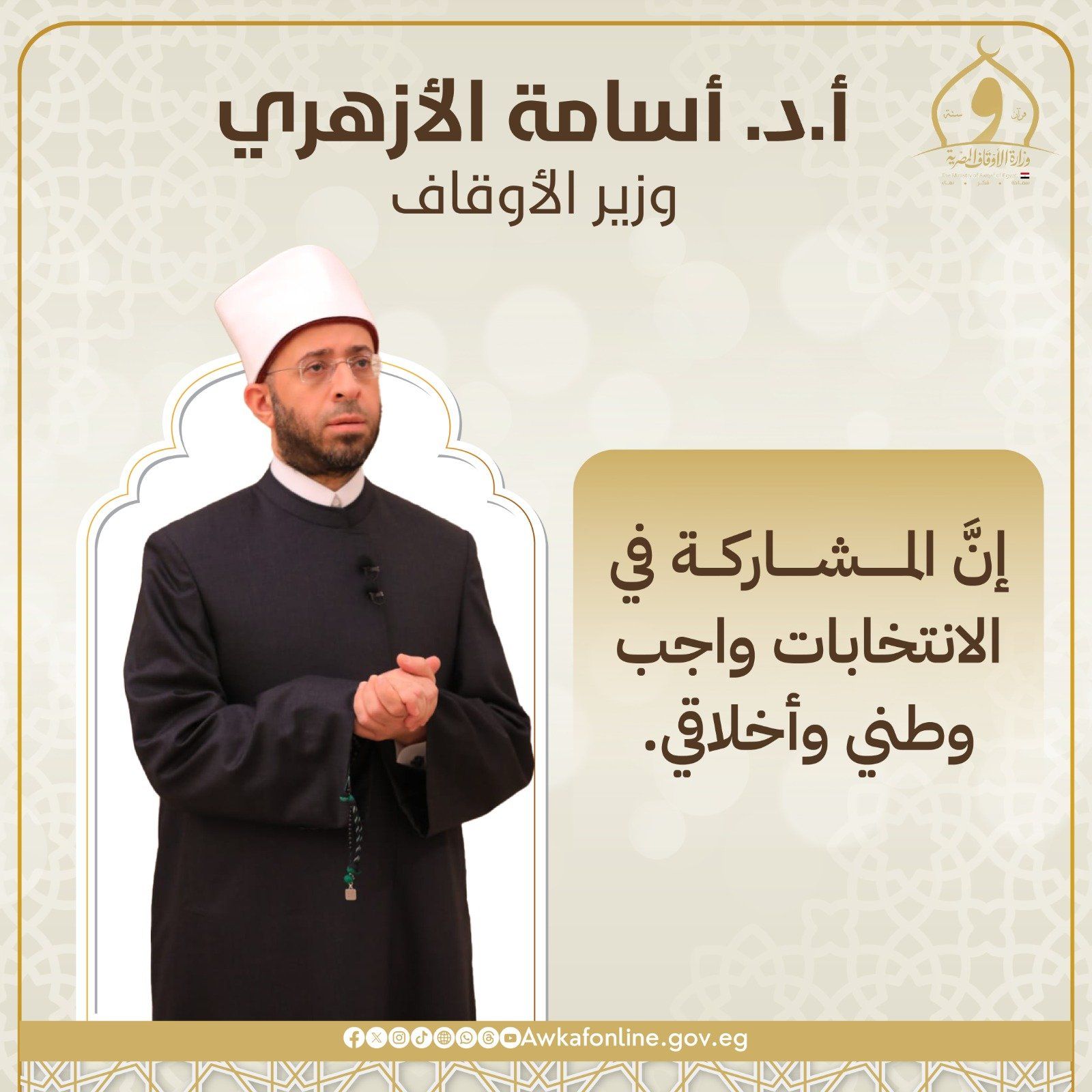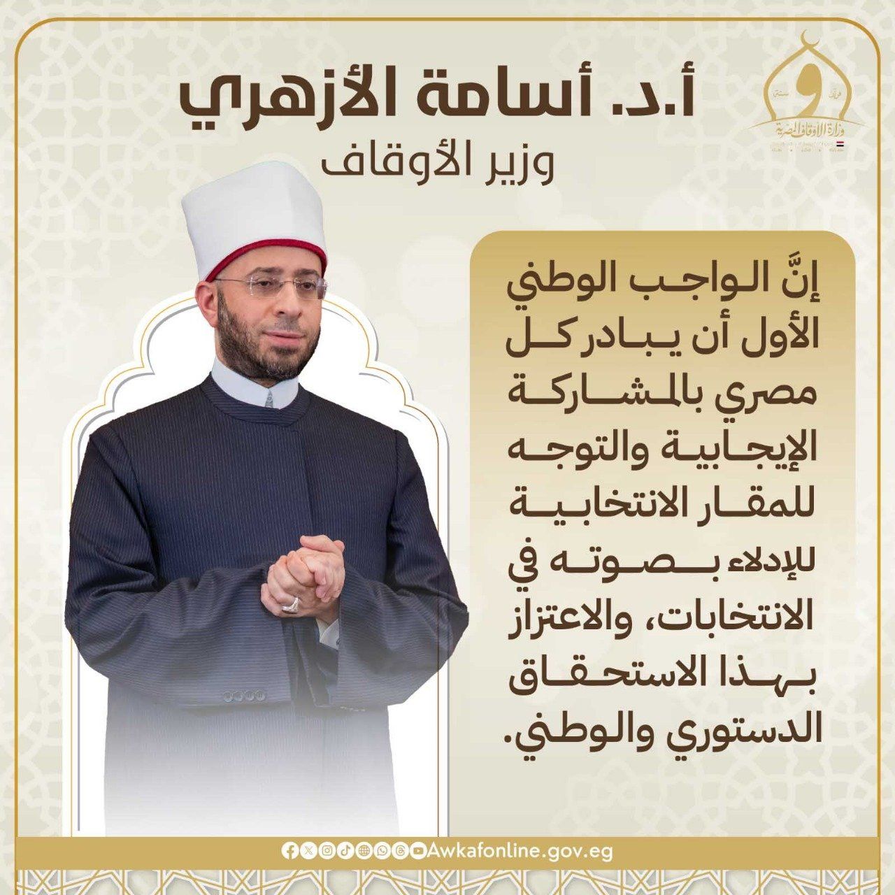 أكد الدكتور أسامة الأزهري وزير الأوقاف أن الواجب الوطني الأول هو أن يبادر كل مصري بالمشاركة الإيجابية في الانتخابات، والتوجه إلى المقار الانتخابية للإدلاء بصوته في هذا الاستحقاق الدستوري والوطني، مشددا على أن المشاركة في الانتخابات واجب وطني وأخلاقي، وأن الأمم لا تنهض إلا بمشاركة أبنائها في اتخاذ قراراتها.
