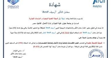 في إنجازٍ علمي جديد يُضاف إلى سجل التميز الأكاديمي لـ جامعة حلوان، أعلن معامل التأثير والاستشهادات المرجعية للمجلات العلمية العربية (أرسيف – ARCIF)، أحد مبادرات قاعدة بيانات "معرفة" للإنتاج والمحتوى العلمي، عن إدراج المجلة العلمية للبحوث والدراسات التجارية الصادرة عن كلية التجارة وإدارة الأعمال بجامعة حلوان ضمن قوائم المجلات المعتمدة لعام 2025، بعد نجاحها في تحقيق المعايير العالمية لاعتماد معامل أرسيف، والتي يبلغ عددها (32) معيارًا دوليًّا.
