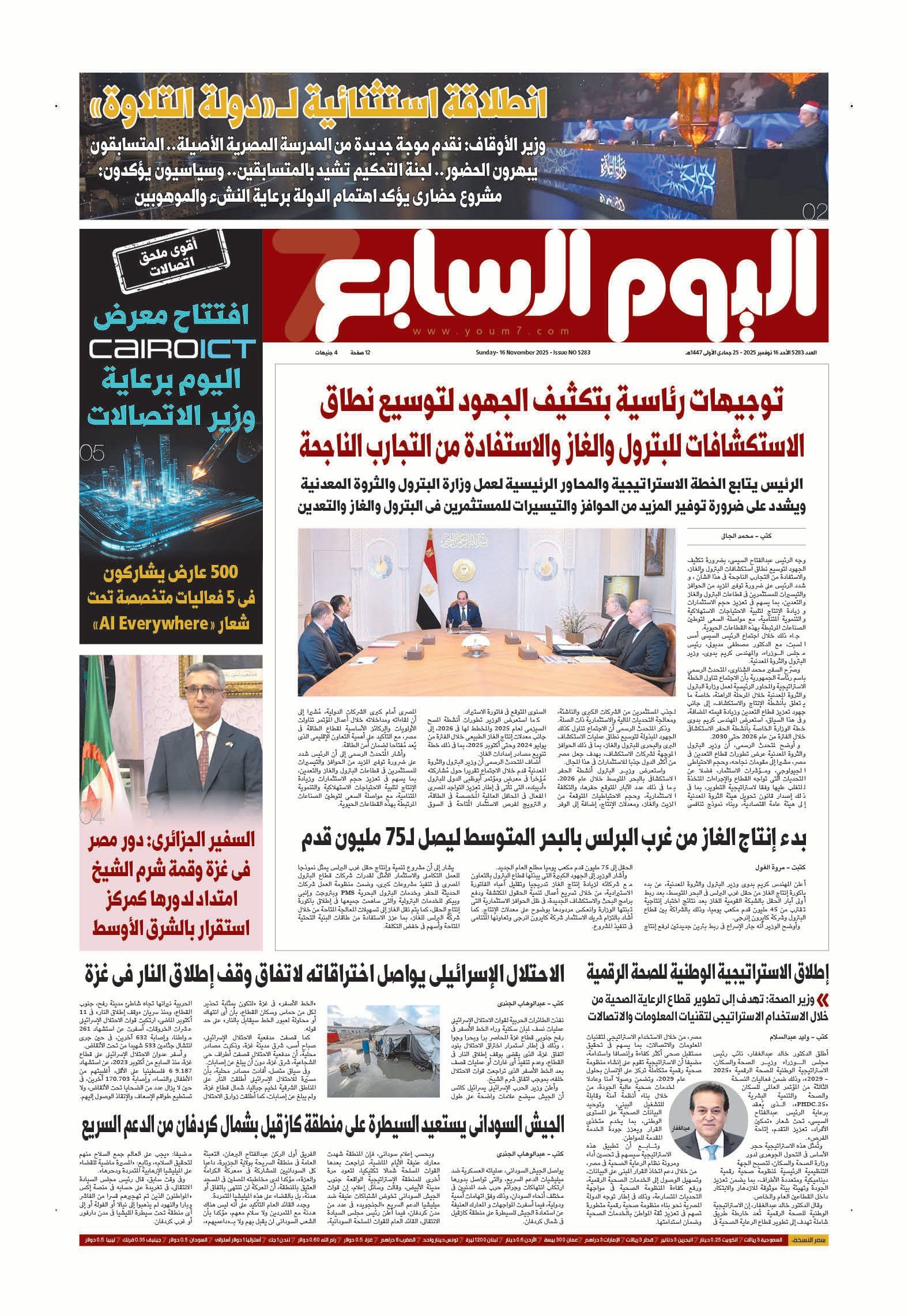 بدء إنتاج الغاز من غرب البرلس بالبحر المتوسط ليصل لـ75 مليون قدمإطلاق الاستراتيجية الوطنية للصحة الرقمية.. وزير الصحة: تهدف إلى تطوير قطاع الرعاية الصحية من خلال الاستخدام الاستراتيجى لتقنيات المعلومات والاتصالات