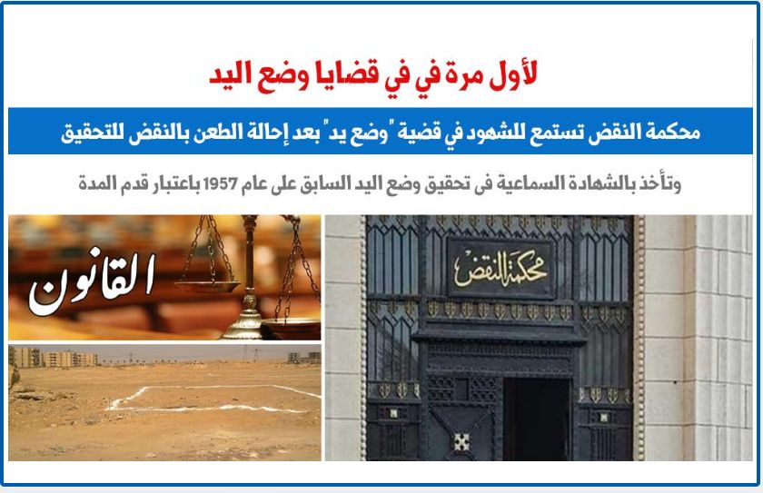 أولا:الطعن الماثل كان طعن لثانى مرة بعد أن قضى لصالح الحكومة فى طعنها بنقض الحكم الأول.ثانياً:المحكمة أوقفت التنفيذ مؤقتا ثم حققت موضوع الطعن بالطرق العادية للإثبات، لأنه طعن لثانى مرة واستمعت إلى أقوال شهود أمام محكمة النقض.ثالثا:اعتماد مبدأ الشهادة السماعية فى تحقيق وضع اليد المكسب للملكية لمدة سابقة عن عام 1957 وهو تاريخ تعديل أحكام القانون المدنى بعدم تملك أملاك الدولة الخاصة بوضع اليد. وإليكم التفاصيل كاملة:في سابقة قضائية.. محكمة النقض تستمع للشهود في قضية "وضع يد" بعد إحالة الطعن بالنقض للتحقيق.. وتأخذ بالشهادة السماعية فى تحقيق وضع اليد السابق على عام 1957 باعتبار قدم المدة.. وتقضى بثبوت وضع يدهم على أرض النزاع