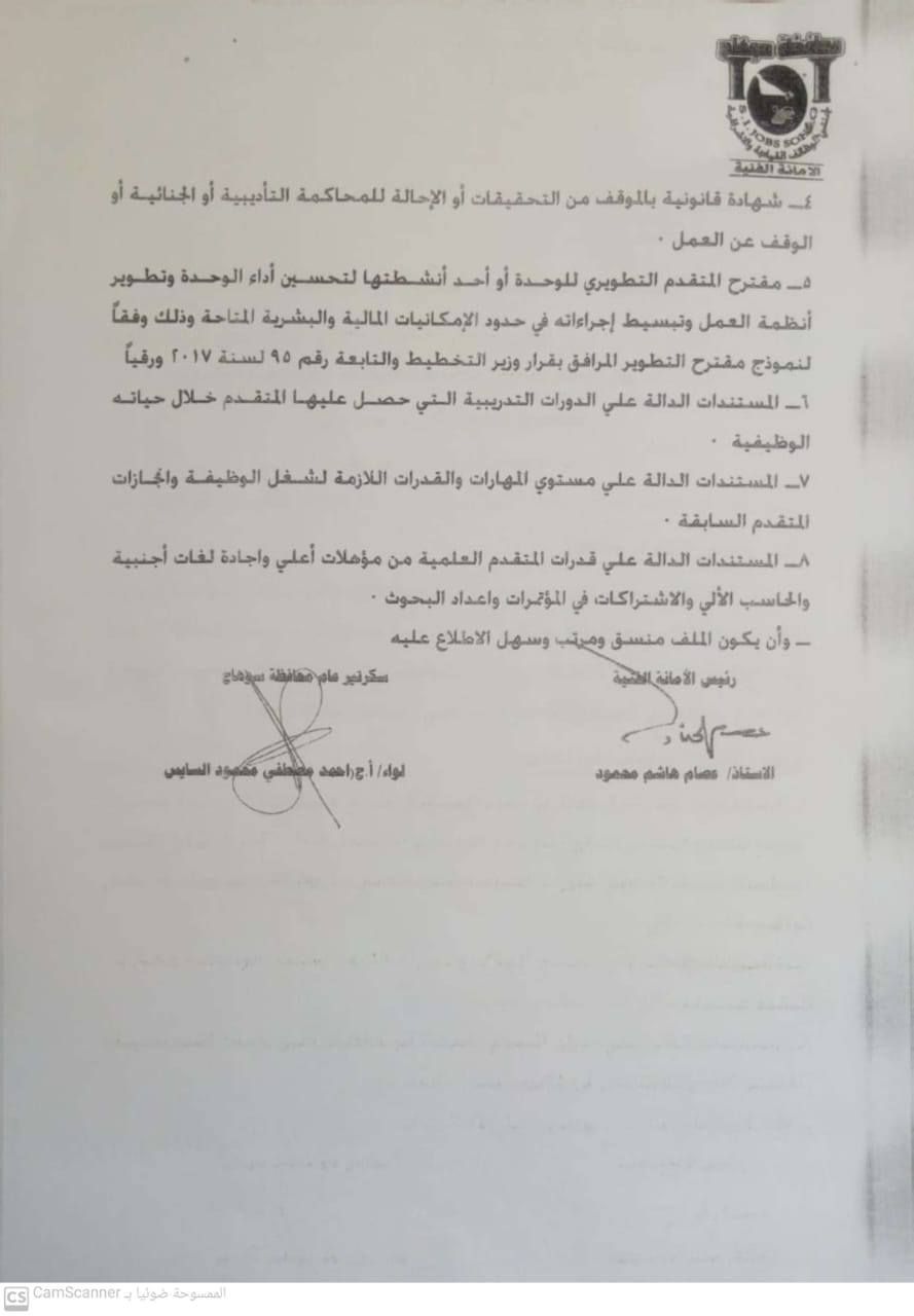 وأكدت المديرية أن على المتقدمين استيفاء شروط شغل الوظيفة طبقًا لبطاقة الوصف المعتمدة وشروط قانون الخدمة المدنية رقم 81 لسنة 2016، وتقديم عدد (7) ملفات متكاملة تشمل المستندات المطلوبة، على أن يتم تسليمها إلى الأمانة الفنية للوظائف القيادية بديوان عام محافظة سوهاج من الساعة الواحدة ظهرًا حتى الثالثة عصرًا.